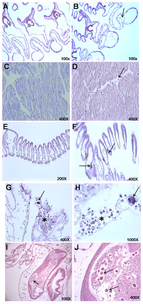Histopathological microphotographs of Argopecten ventricosus, showing effects of exposure to the toxic dinoflagellate Gymnodinium catenatum. Exposed scallops (n = 12) (B, D, F, G, H, I, and J) and control scallops (n = 12) (A, C, and E). (B) Hemocyte aggregation in gill filaments; (D) Hemocyte aggregation in adductor muscle; (F) Gills with melanization; (G) Dinoflagellate in gills (arrow); (H) Dinoflagellate in mantle (arrow). Note the hemocyte aggregation (arrow) near the dinoflagellate (asterisk) and mucus production; (I and J) Dinoflagellates in the intestine and in the gonad (arrows).