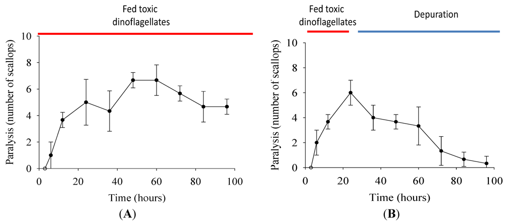 In feeding experiments, some scallops were paralyzed and recovered hours later. In Experiment 3, kinetics of paralysis was assessed, as described by Hégaret et al. [29] after appearance of a gaping shell. Gaping scallops were mechanically stimulated on the gills and adductor muscle with a micropipette; if the scallops did not react with movement, they were considered paralyzed. Viability of paralyzed scallops was determined by examining the clarity of the water and production of feces after feeding low concentrations of non-toxic microalgae. Recovery of paralyzed scallops was determined by observation of reduced shell gaping and recovery of muscle function.