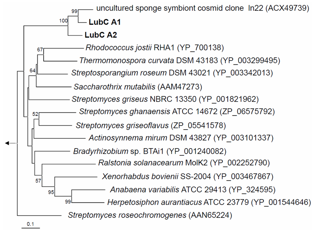 Neighbor-joining tree of translated NRPS A domains. Bootstrap values greater than 50% are indicated at the nodes. LubC A1 and A2 are the two adenylation domains from the NRPS structural gene lubC, which contains the two modules each bearing a single adenylation domain (see Figure 3). The arrow points to the archaeal outgroup, Methanothermobacter thermoautotrophicus (NP_275799). The scale bar indicates 0.1 substitutions per amino acid position.