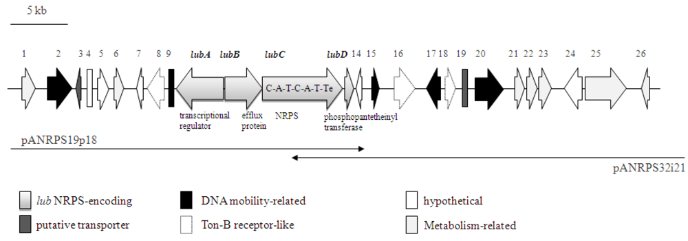 Genetic organization of the NRPS containing metagenomic cosmid clone from Aplysina aerophoba (AANRPS; Acc# HQ456128). Overlapping cosmids pANRPS19p18 and pANRPS32i21 and ORF numbers are indicated. Putative functions of lub genes-encoded NRPS proteins, as well as domain organization of lubC are depicted.