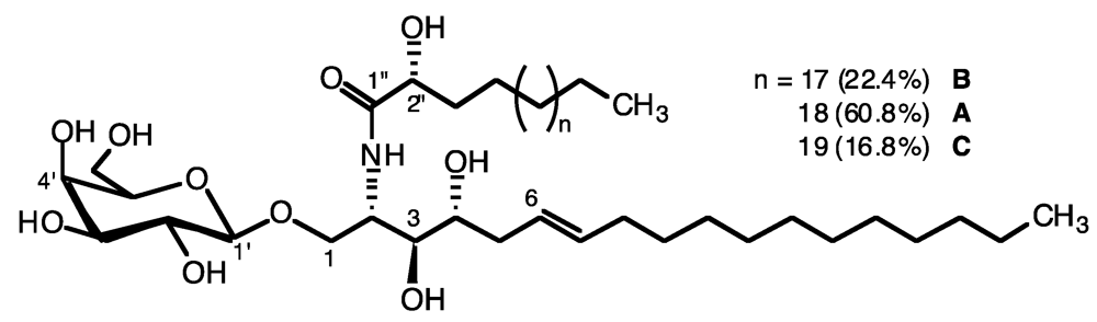 In conclusion, axidjiferosides were identified as three homologous β-galactopyranosylceramides composed of 2-amino-(6E)-octadec-6-en-1,3,4-triol and the major one, axidjiferoside-A (around 60%), contained 2-hydroxytetracosanoic acid.