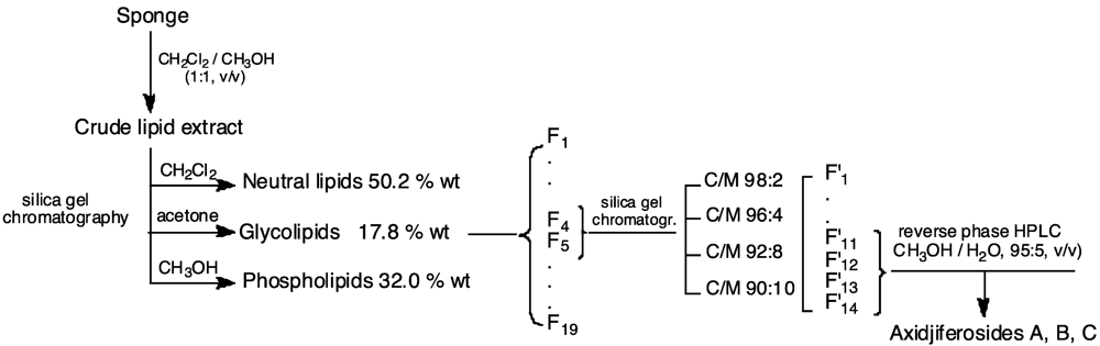 Whole bodies of the collected specimens were chopped and investigated for their GL fractions. They were twice extracted with CH2Cl2/MeOH (1:1, v/v) at room temperature. The combined extracts were concentrated in vacuo to give the crude extract, which was partitioned between H2O and CH2Cl2. The dried organic layer was concentrated in vacuo, and the residue was submitted to a column chromatography over silica gel (230–400 mesh), eluting with pure solvents of increasing polarity, to obtain the different lipid classes: dichloromethane (neutral lipids, 50.2%), acetone (GL, 17.8%) and methanol (phospholipids, 32.0%) (Figure 3).