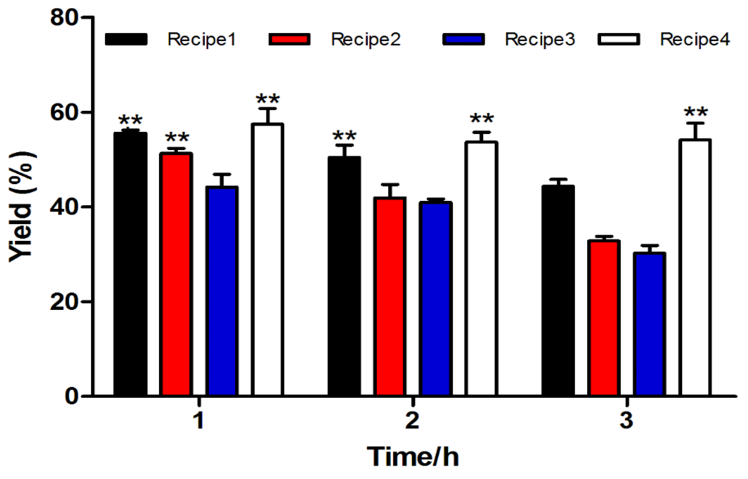 Yield of alpha-conotoxin (α-CTx) TxIB resin-bounded peptide undergoing different cleavage conditions. The two-way ANOVA/Tukey test and three replicates were used for analysis, and data were expressed as the mean ± SEM (** p < 0.01); the values were compared to Recipe 3.
