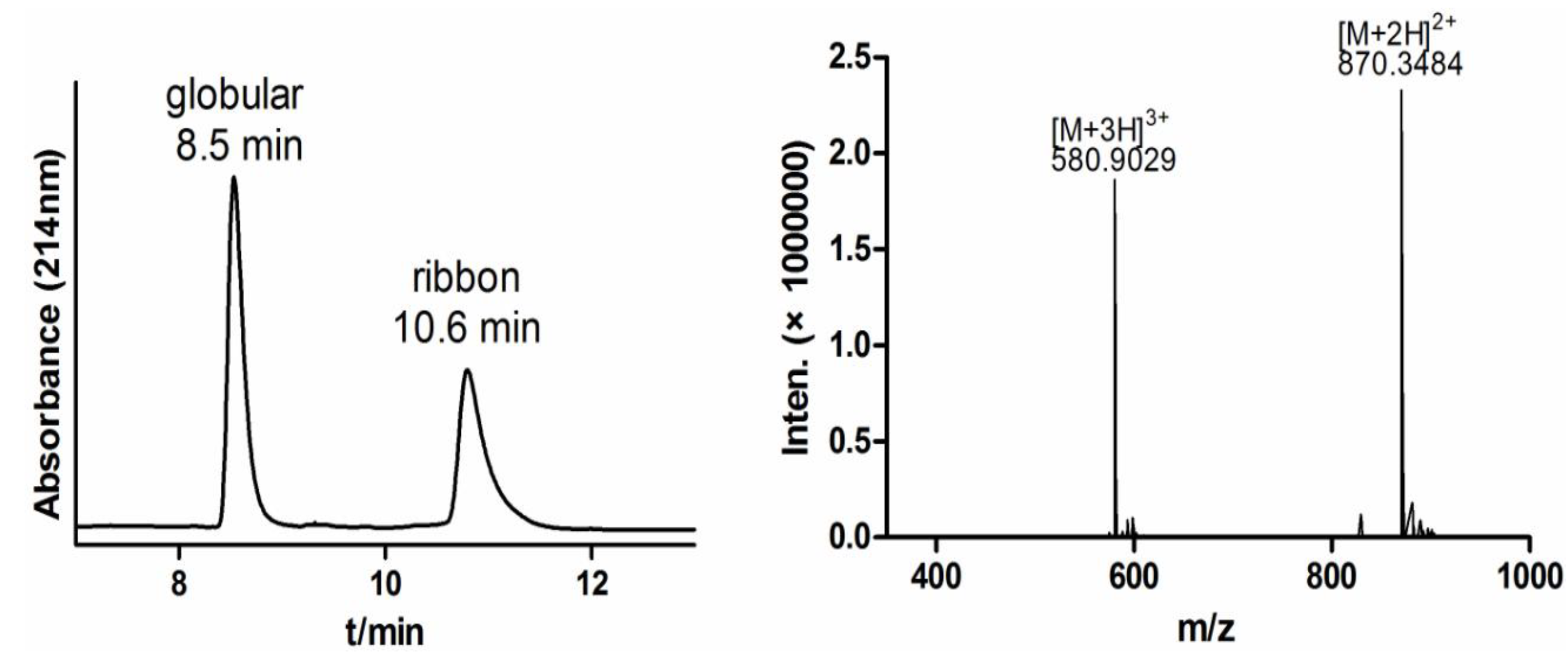 HPLC and ESI-MS mass spectrometry analysis of the TxIB “globular” isomer and “ribbon” isomer by two-step oxidative folding. (A) HPLC traces of globular and ribbon TxIB. Analytical HPLC was carried out using an analytical Vydac C18 (5 μm, 4.6 mm × 250 mm). The separation method was as follows: a 10%–30% solvent B gradient over 30 min (solvent B is 0.05% TFA in 90% ACN; solvent A is 0.1% TFA in H2O). (B) ESI-MS analysis of the globular and ribbon isomers. Its calculated mass was 1739.70.