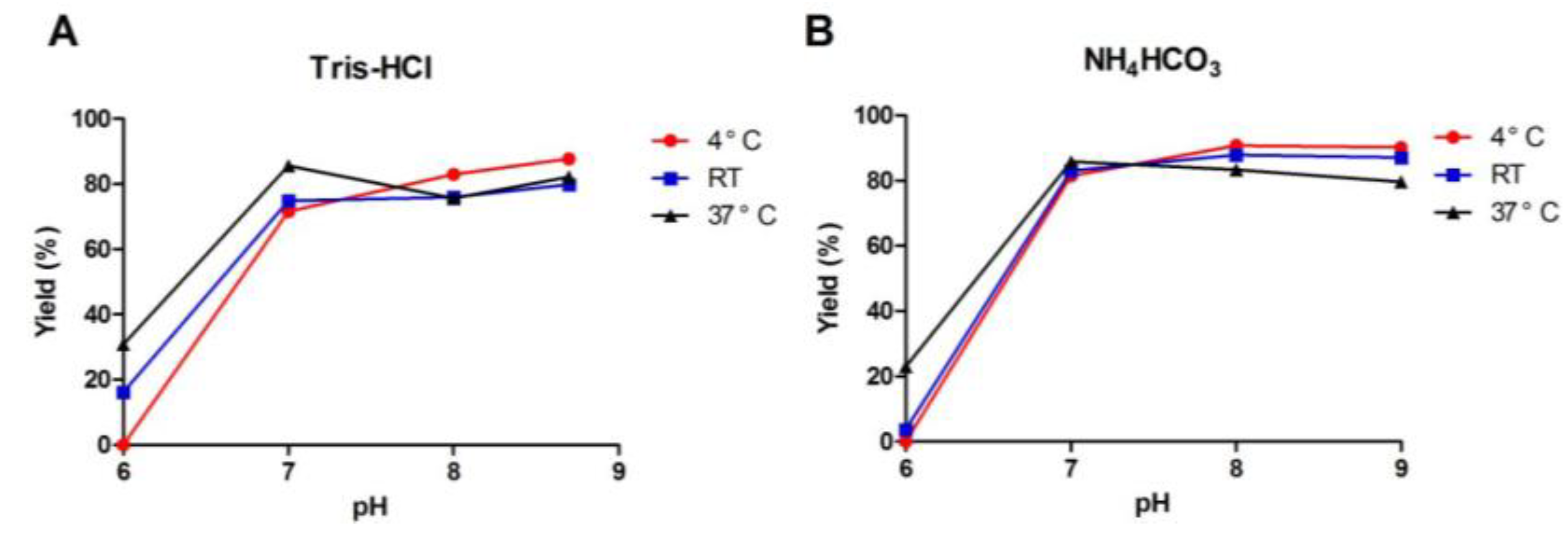 Effect of temperature and pH on globular isomer yield in Tris-HCl buffer (A) and in NH4HCO3 buffer (B). The pH clearly influenced folding yield. At higher pH, a much higher proportion of correctly folded isomer was obtained, while temperature is a minor factor in oxidative folding. The pH 8 and 4 °C were optimal for TxIB oxidative folding.