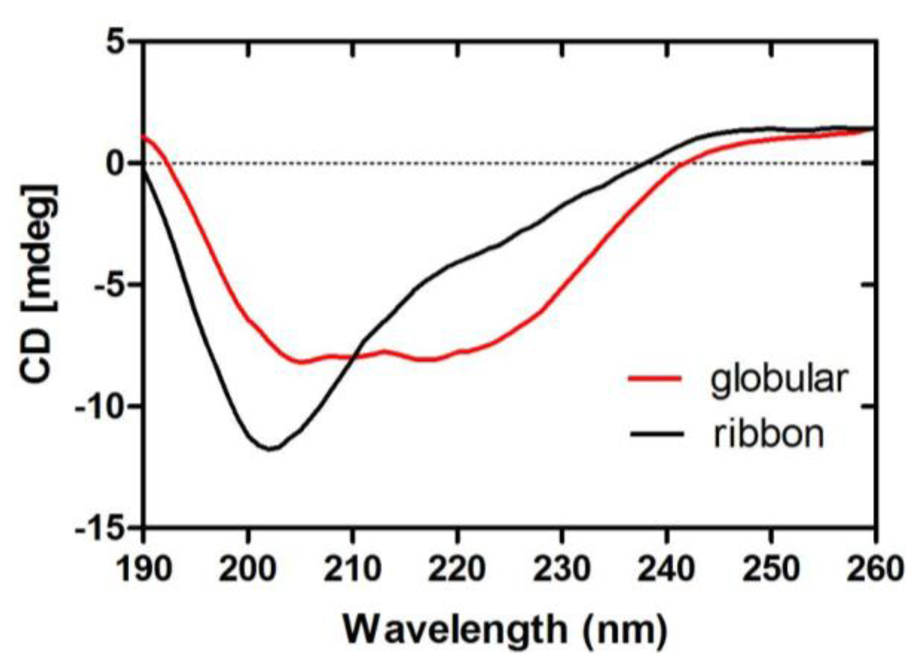 Circular Dichroism (CD) spectra of globular and ribbon isomers of α-CTx TxIB. The globular isomer (red) displayed a double minimum around at 208 and 222 nm, and the ribbon isomer (black) displayed a minimum at 202 nm.