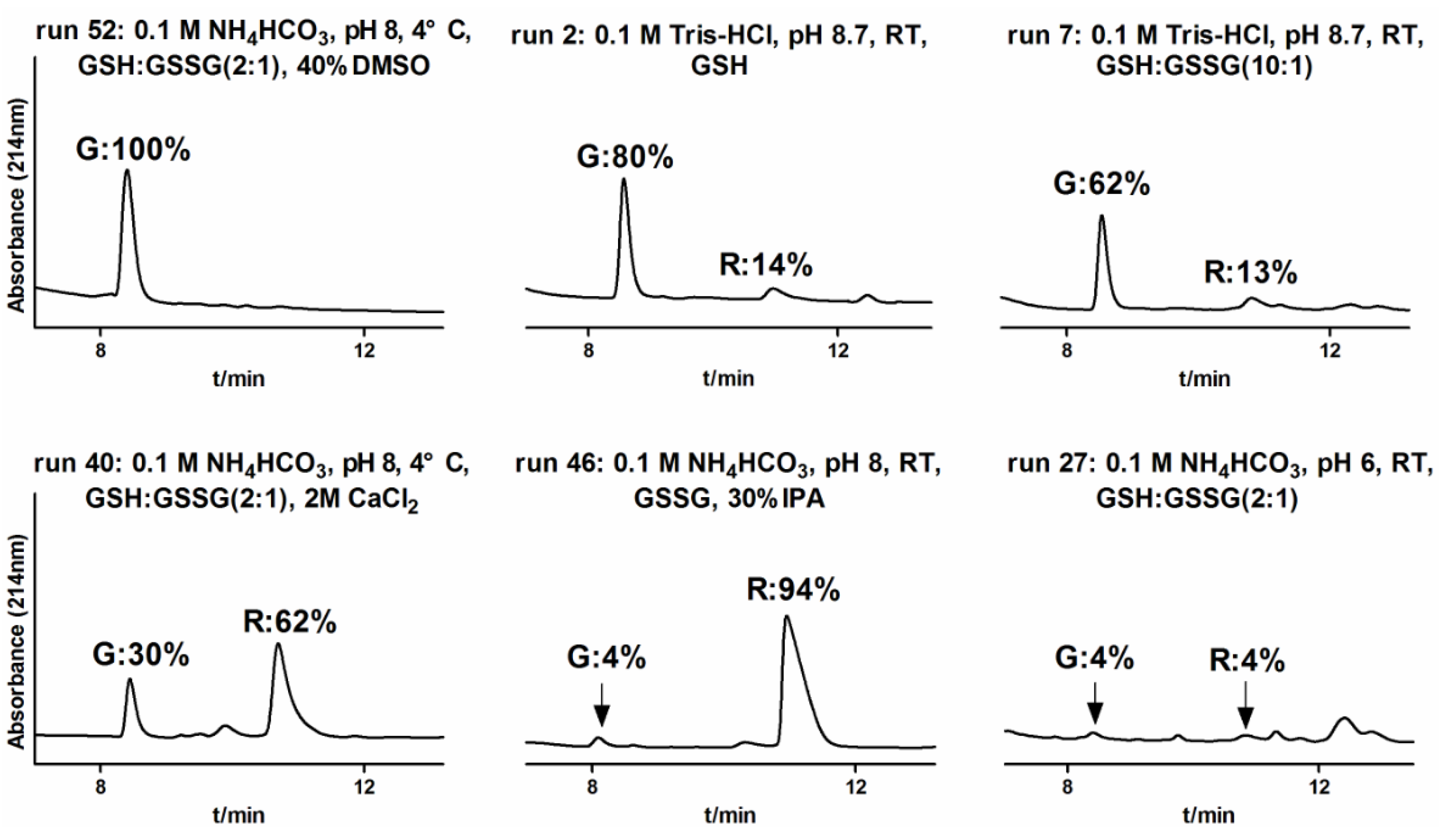 | 30 | 0.1 M NH4HCO3 | GSH:GSSG (2:1) | 7 | RT | - | 83 | 13 |
