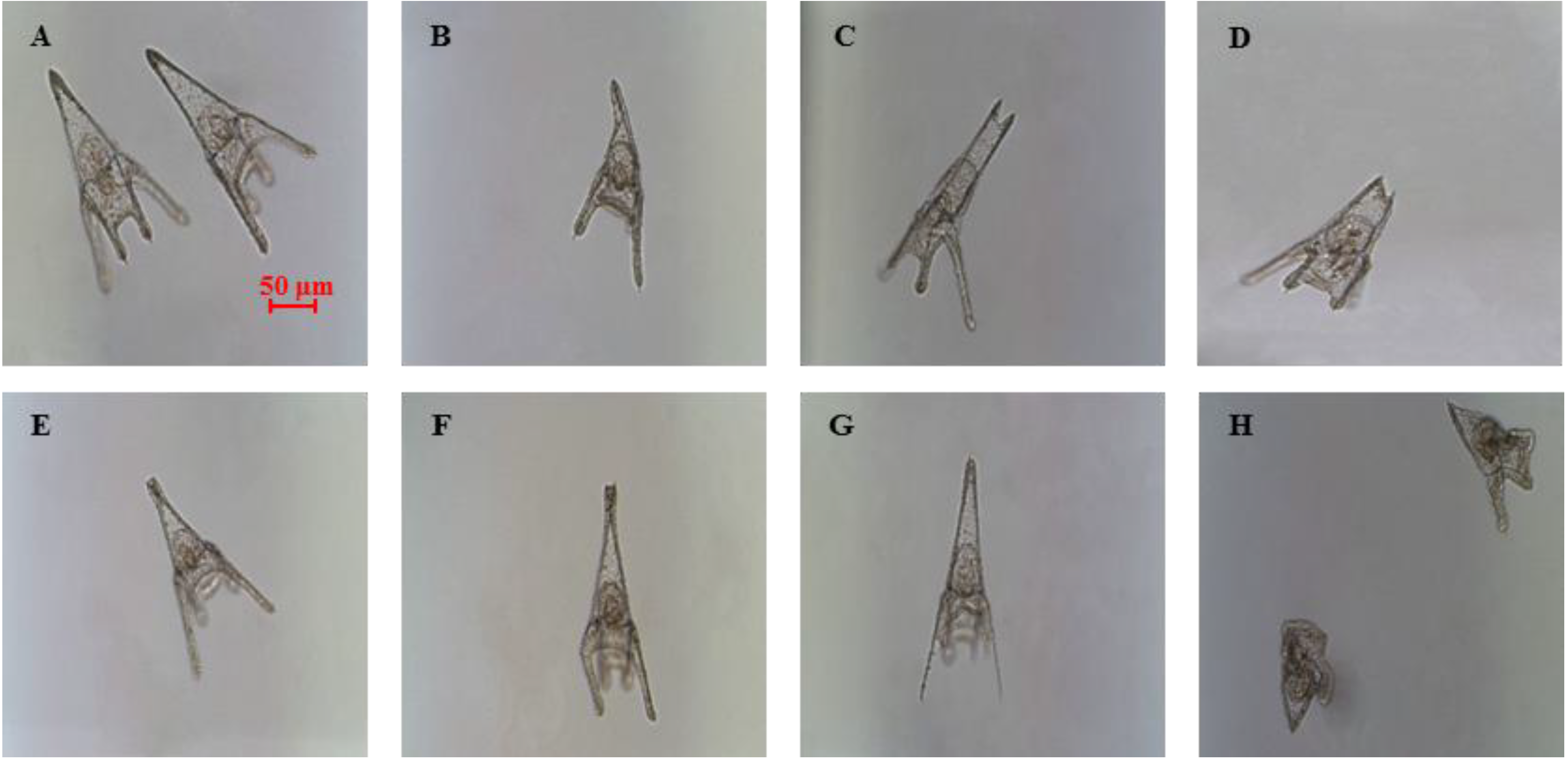 Examples of malformations induced in Paracentrotus lividus plutei at 48 hours post fertilization (hpf) after incubation with the three polyunsaturated aldehydes (PUAs), heptadienal, octadienal and decadienal (B–H) in comparison with (A), the control; embryos are in sea water without aldehydes.