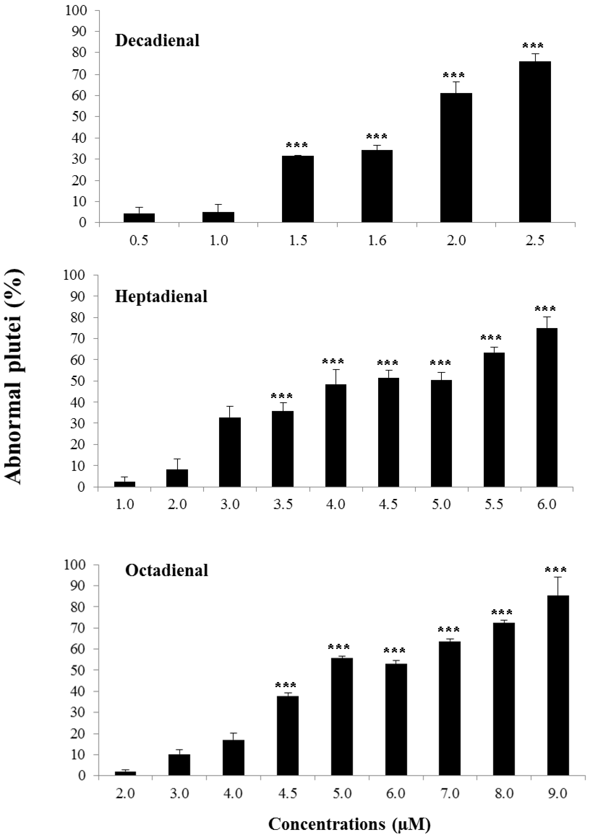 Percentage of abnormal plutei (%) produced when Paracentrotus lividus newly-fertilized eggs are exposed to different concentrations (in μM) of heptadienal, octadienal and decadienal for 48 h post fertilization (*** with a p-value <0.001, Student’s t-test, GraphPad Software Inc.,San Diego, CA, USA).