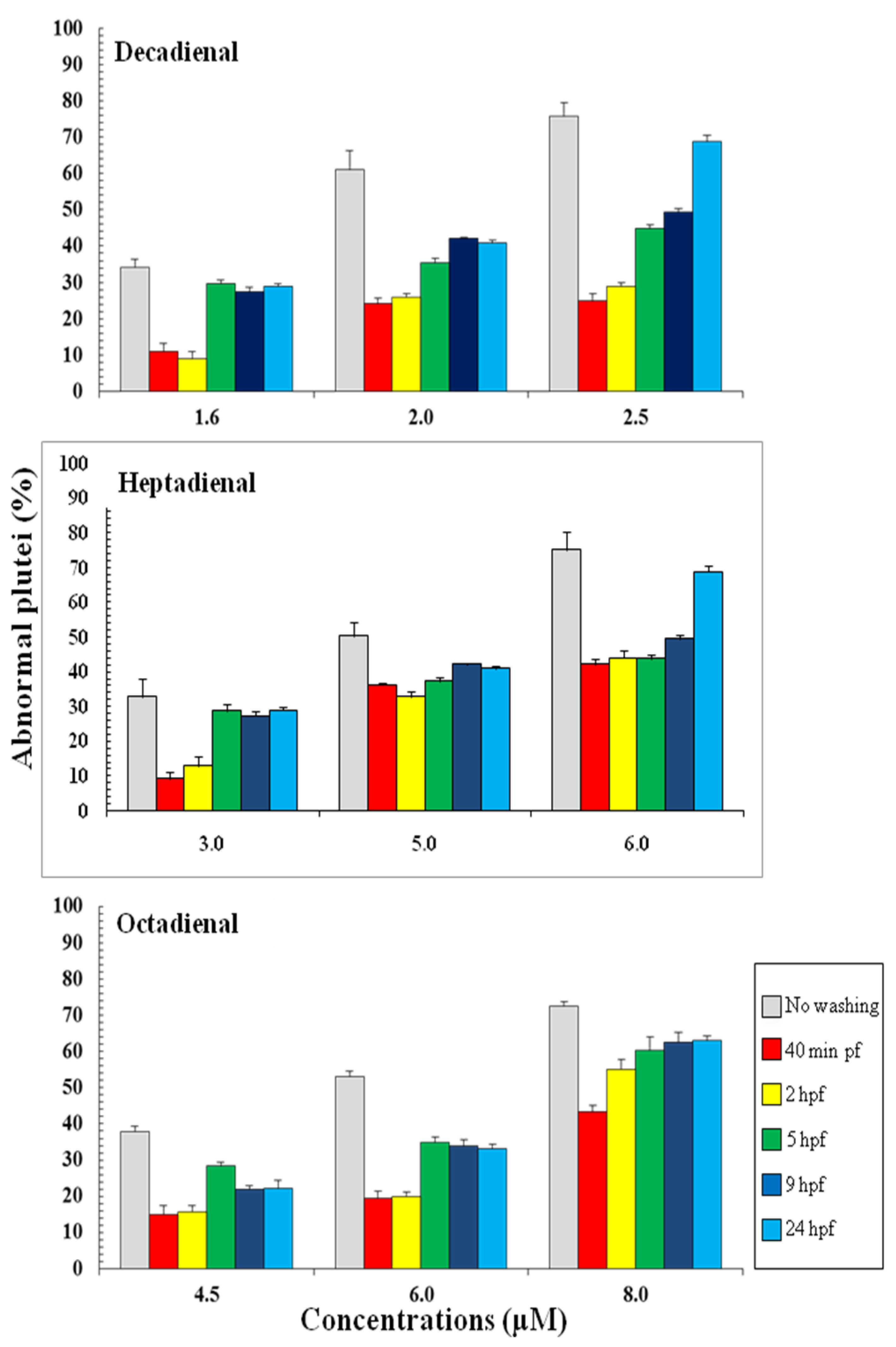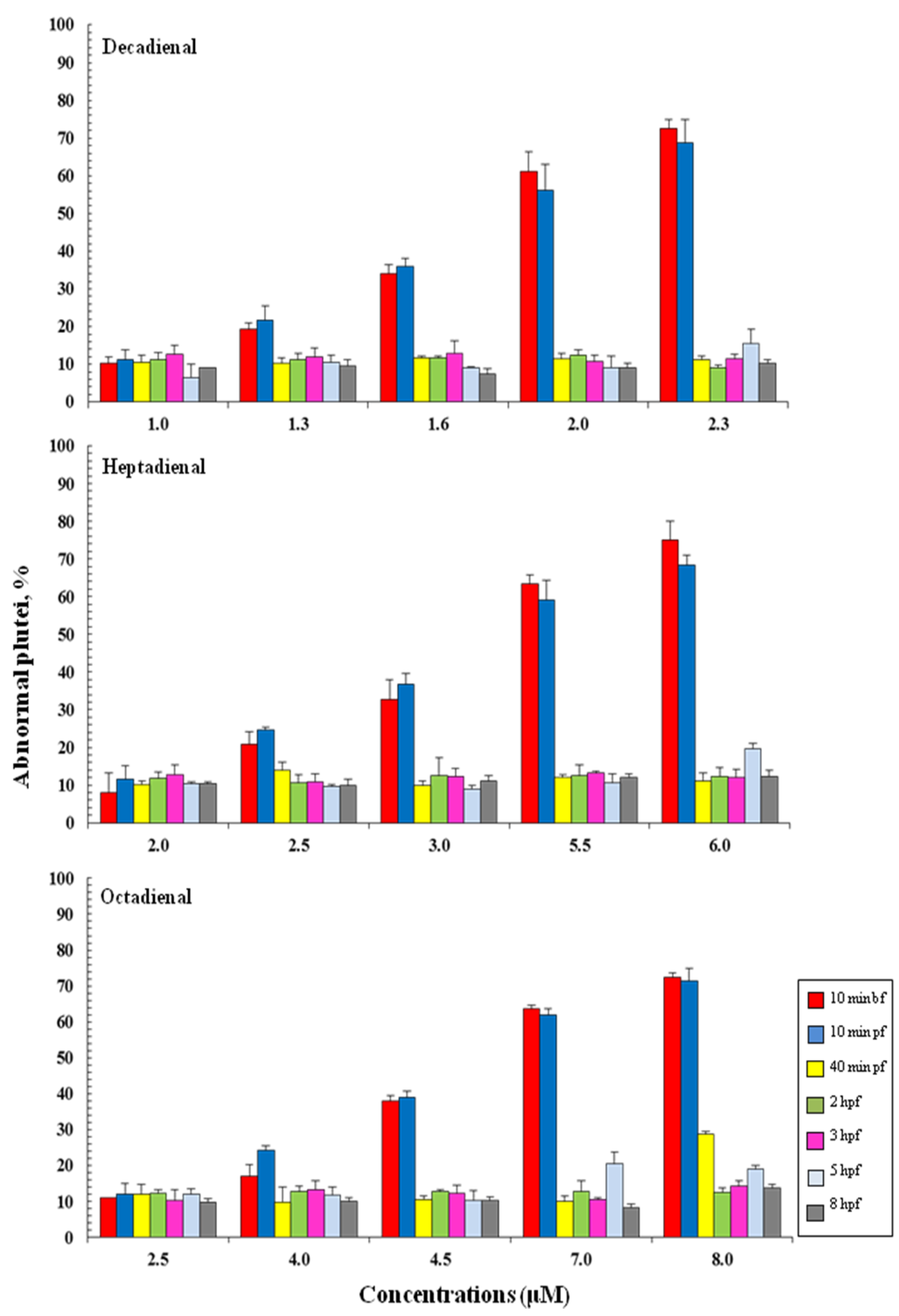The percentage of abnormal Paracentrotus lividus plutei (%) produced after the exposure of newly fertilized eggs to different concentrations of heptadienal, octadienal and decadienal and examined at different developmental stages: 10 min before fertilization (bf), 10 min and 40 min post fertilization (pf) and two, three, five and 8 hpf.