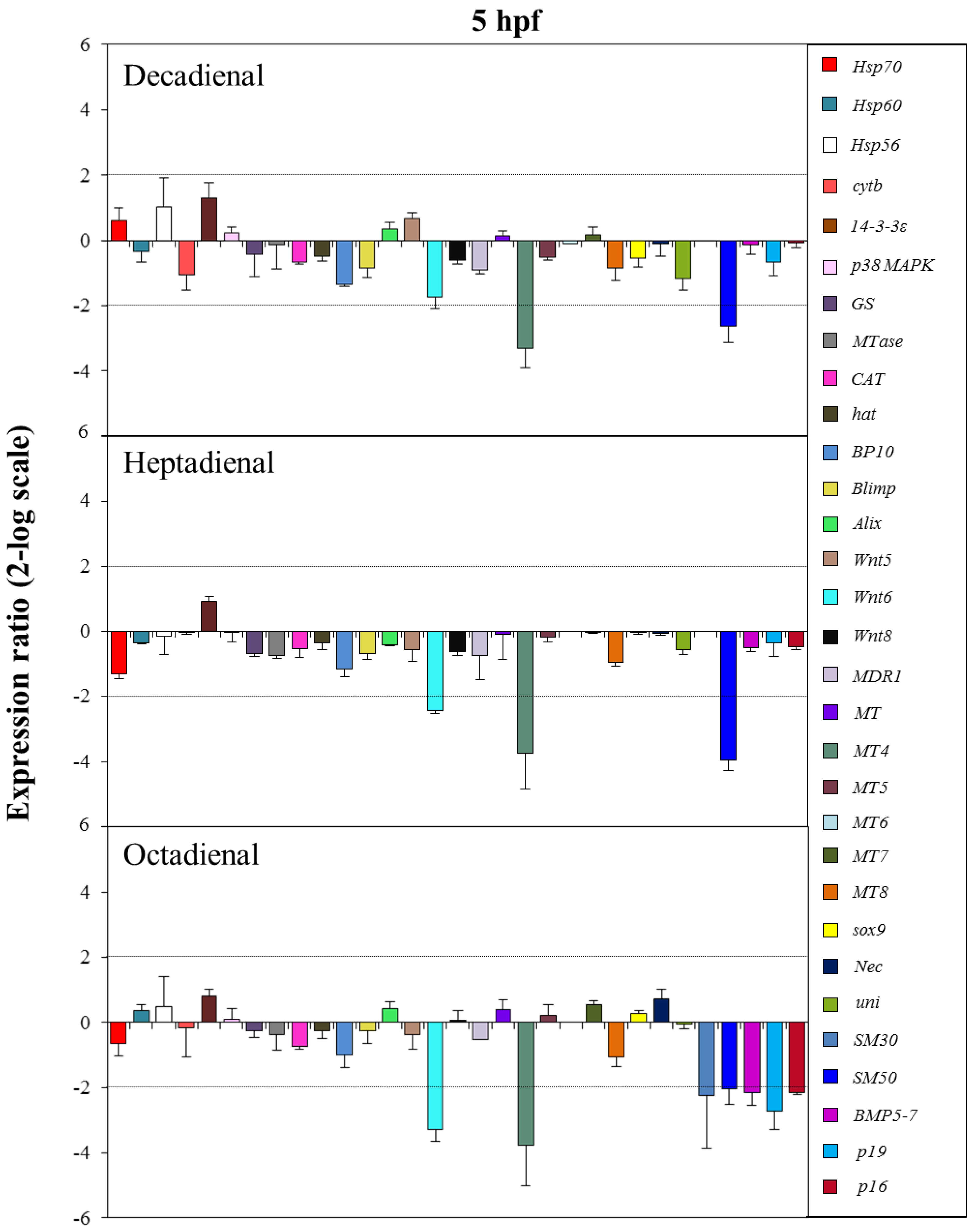 The histograms show the differences in the expression levels of thirty one genes followed by real-time qPCR. Paracentrotus lividus embryos were grown in the presence of decadienal, heptadienal and octadienal at teratogenic concentrations (1.6, 3.0 and 4.5 μM, respectively) and collected at 5 hpf. Data are reported as a fold difference (mean ± SD), compared to the control embryos in sea water without aldehydes. Fold differences greater than ±2 (see the dotted horizontal guide lines at the values of +2 and −2) were considered significant.
