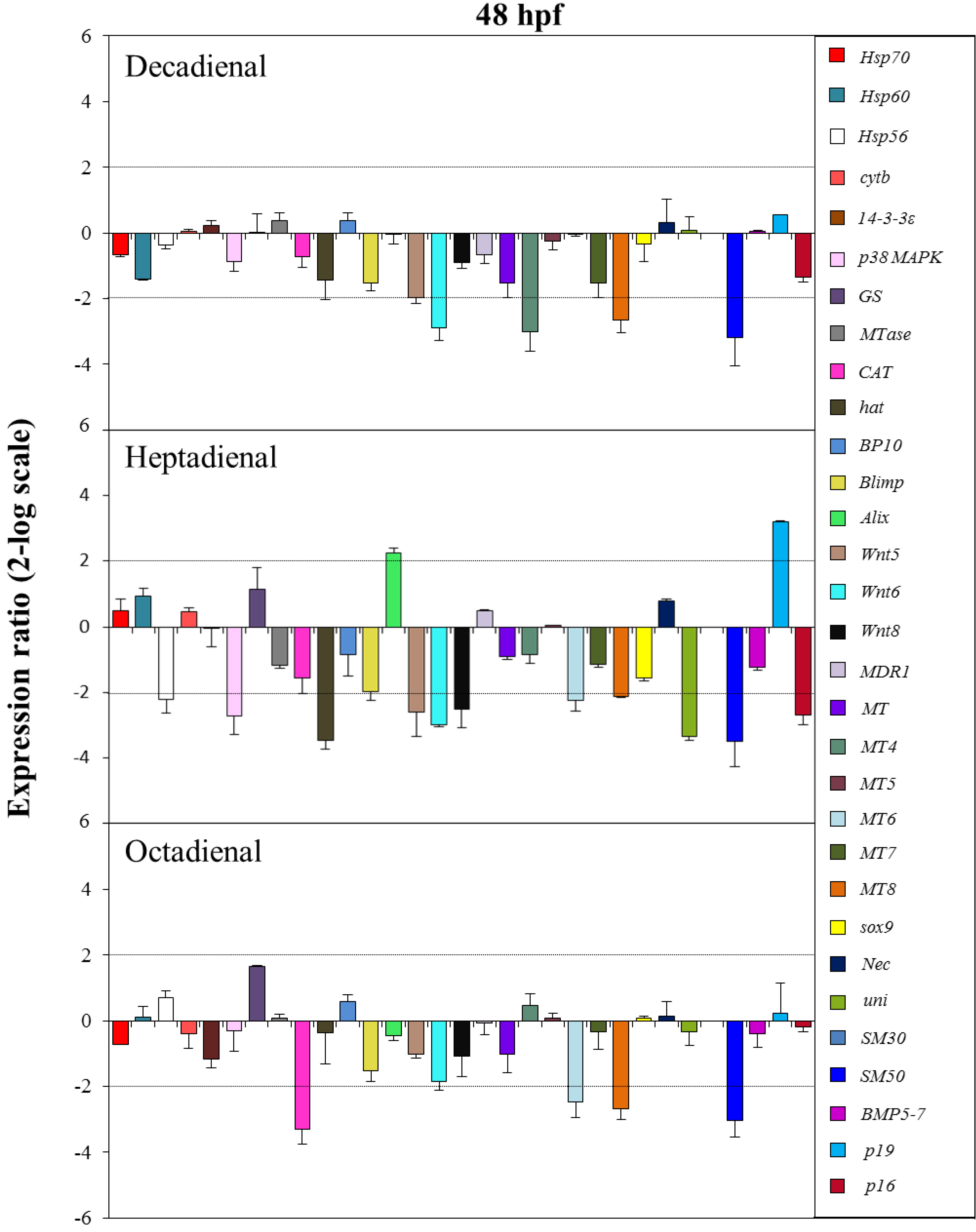 The histograms show the differences in the expression levels of thirty one genes followed by real-time qPCR. Paracentrotus lividus embryos were grown in the presence of decadienal, heptadienal and octadienal at teratogenic concentrations (1.6, 3.0 and 4.5 μM, respectively) and collected at 48 hpf. For more details, see also the legend to Figure 5.
