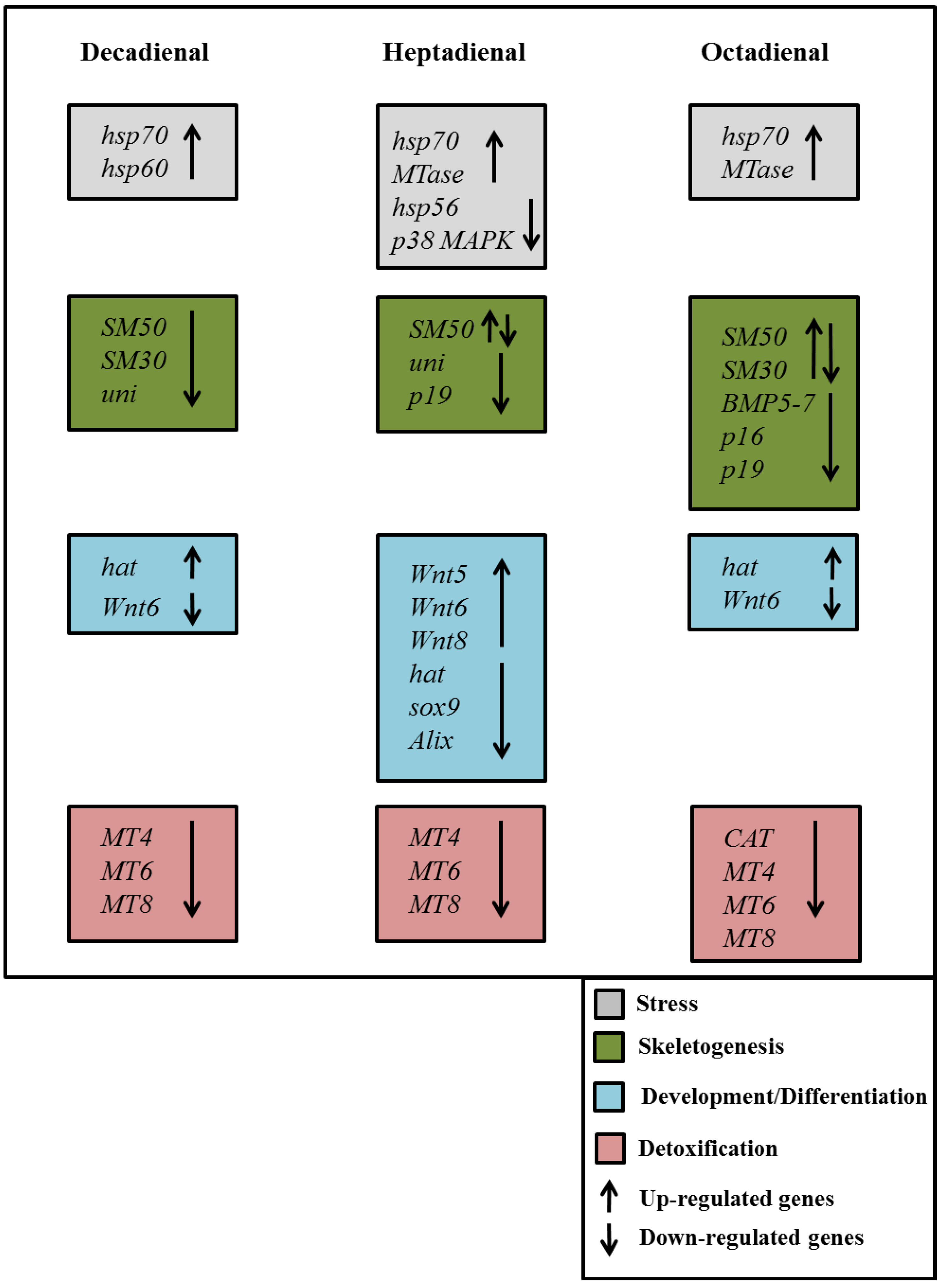An important outcome of this study was the finding that the expression levels of a great number of genes in the sea urchin, P. lividus, appears to be modulated by the PUAs, decadienal, heptadienal and octadienal. A synopsis showing the patterns of up- and down-regulation of different classes of genes is shown in Figure 9. These three aldehydes have very few common targets, but specifically affect different classes of genes and at different times of development.