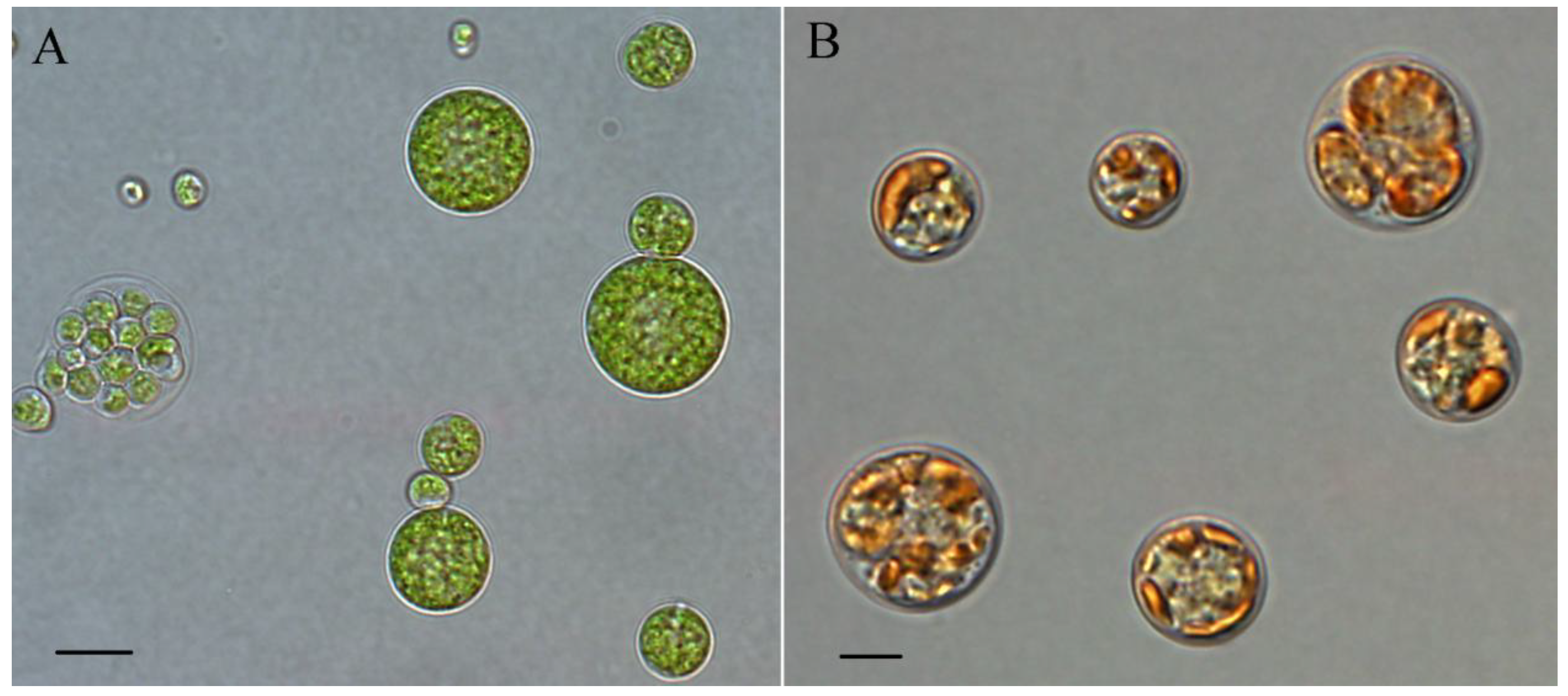 - Krienitz, L.; Bock, C.; Dadheech, P.K.; Pröschold, T. Taxonomic reassessment of the genus Mychonastes (Chlorophyceae, Chlorophyta) including the description of eight new species. Phycologia 2011, 50, 89–106. [Google Scholar] [CrossRef]