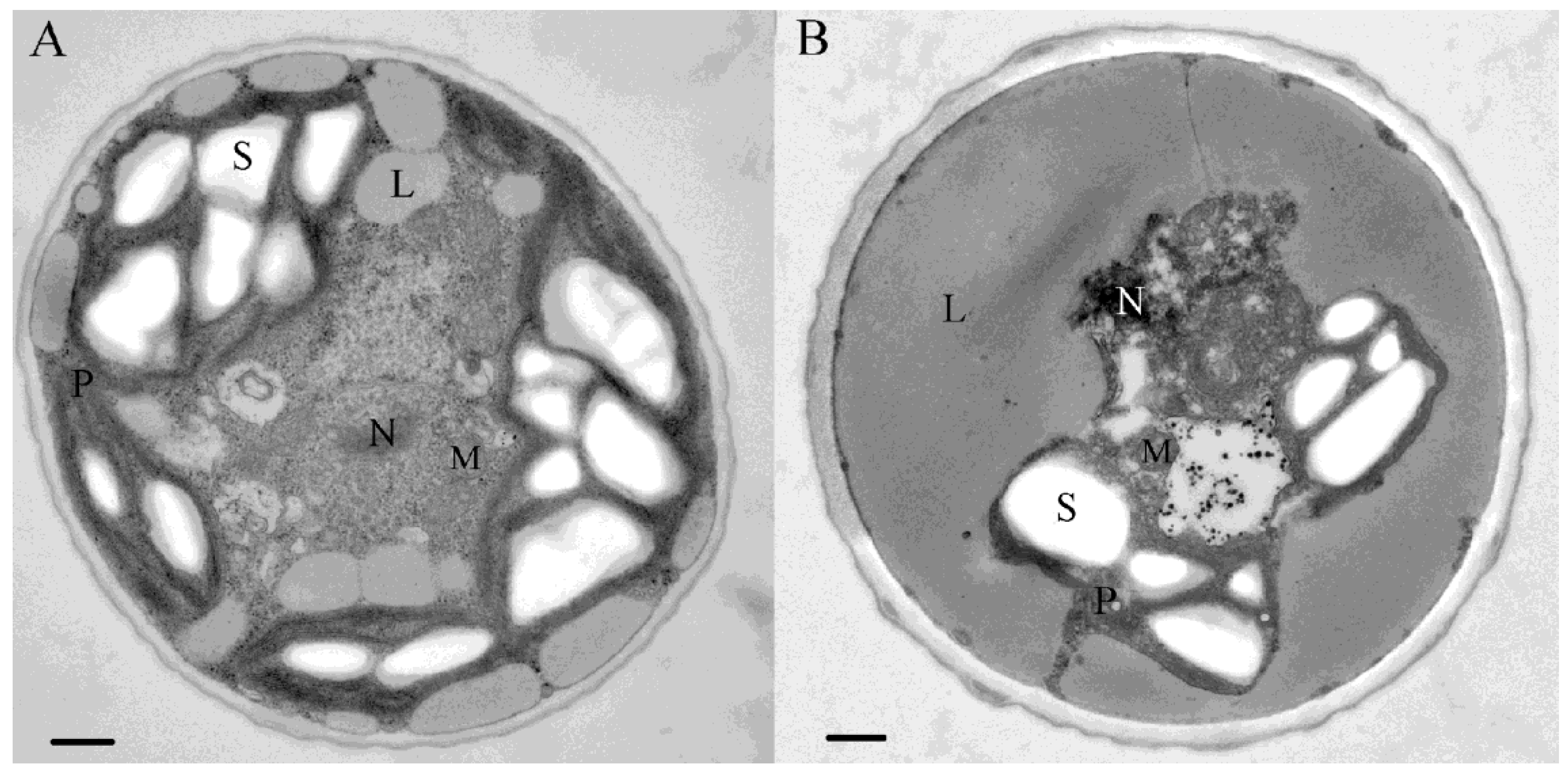 The ultrastructure of C. zofingiensis cells under favorable (A) and stress (B) conditions. Bars, 0.5 μm;·L, lipid body; N, nucleus; M, mitochondria; P, plastid; S, starch granule.