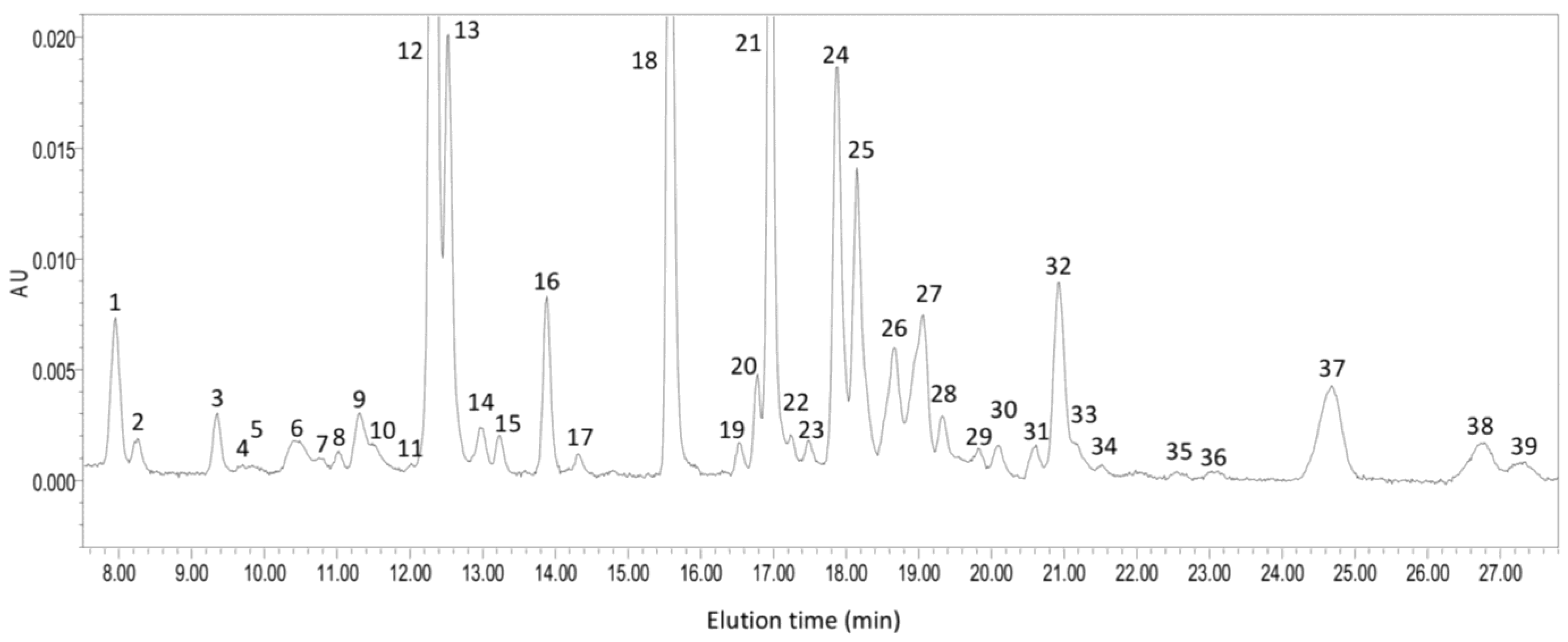 A HPLC chromatogram showing a general pigment profile of C. zofingiensis under astaxanthin-inducing conditions (four-day induction with 20 g L−1 glucose in the dark). 1 Neoxanthin; 2 Violaxanthin; 3 Antheraxanthin; 4, 5, 7, 8, 11, 19, 28, 29, 30, 35, 36 Unknown or degraded lutein and chlorophylls; 6 Astaxanthin; 9, 10 Adonixanthin; 12 Lutein; 13, 14, 15 Zeaxanthin; 16, 17 Canthaxanthin; 18 Chlorophyll b; 20, 22 β-Cryptoxanthin; 21 Chlorophyll a; 23 Echinenone; 24, 26 Astaxanthin mono-ester; 25, 27 Adonixanthin mono-ester; 31 α-Carotene; 32, 33, 34 β-Carotene; 37, 39 Astaxanthin di-ester; 38 Adonixanthin di-ester.