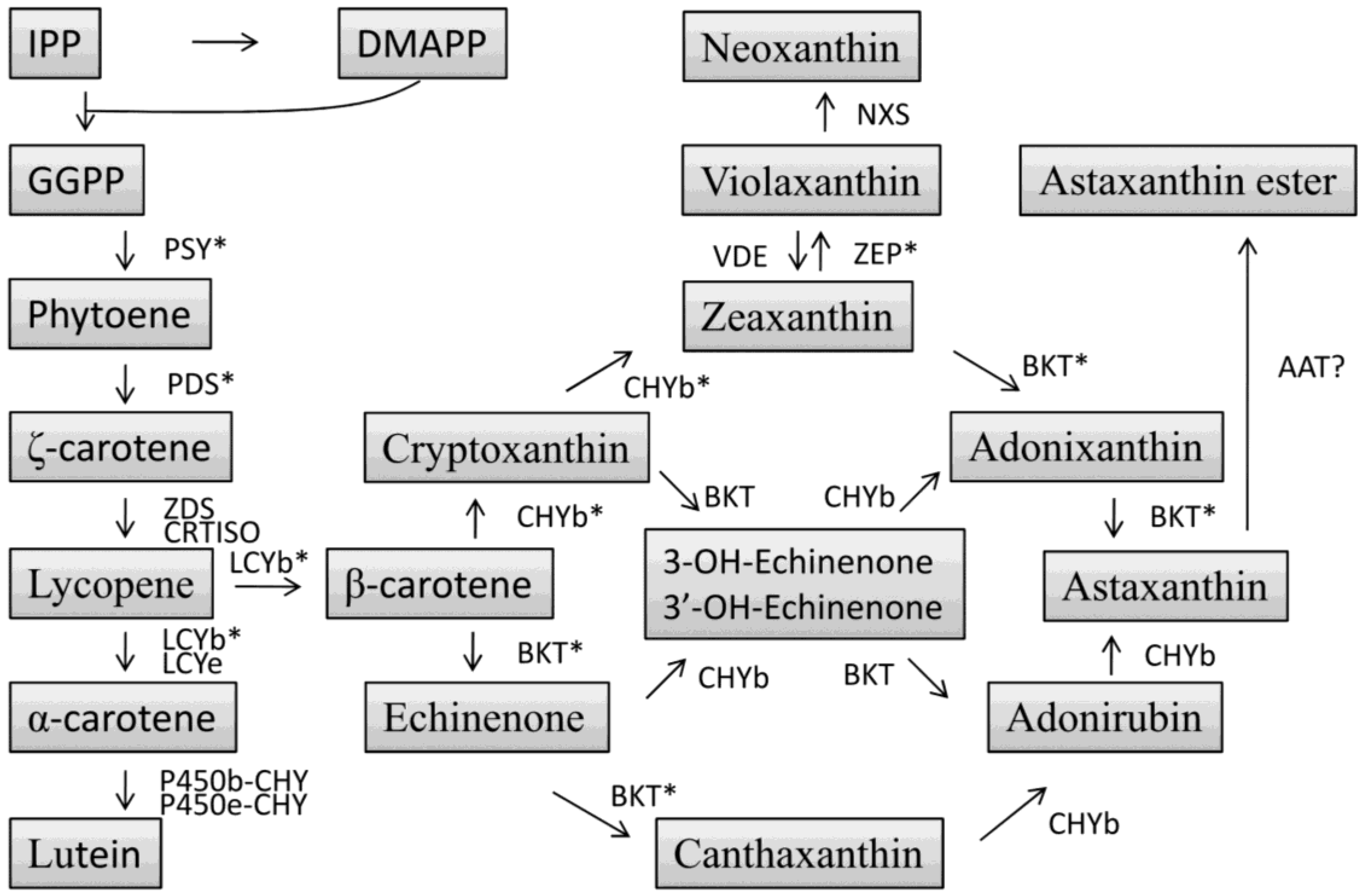 Schematic diagram of possible carotenoid biosynthesis in microalgae. IPP, isopentenyl pyrophosphate; DMAPP, dimethylallyl pyrophosphate; GGPP, geranylgeranyl pyrophosphate; PSY, phytoene synthase; PDS, phytoenedesaturase; ZDS, ζ-carotene desaturase; CRTISO, carotene isomerase; LCYb, lycopene β-cyclase; LCYe, lycopene ε-cyclase; P450b-CHY, cytochrome P450 β-hydroxylase; P450e-CHY, cytochrome P450 ε-hydroxylase; CHYb, β-carotene hydroxylase; BKT, β-caroteneketolase; ZEP, zeaxanthinepoxidase; VDE, violaxanthin de-epoxidase; NXS, neoxanthin synthase; AAT, astaxanthin acyl transferase; * denote the genes characterized in C. zofigiensis.