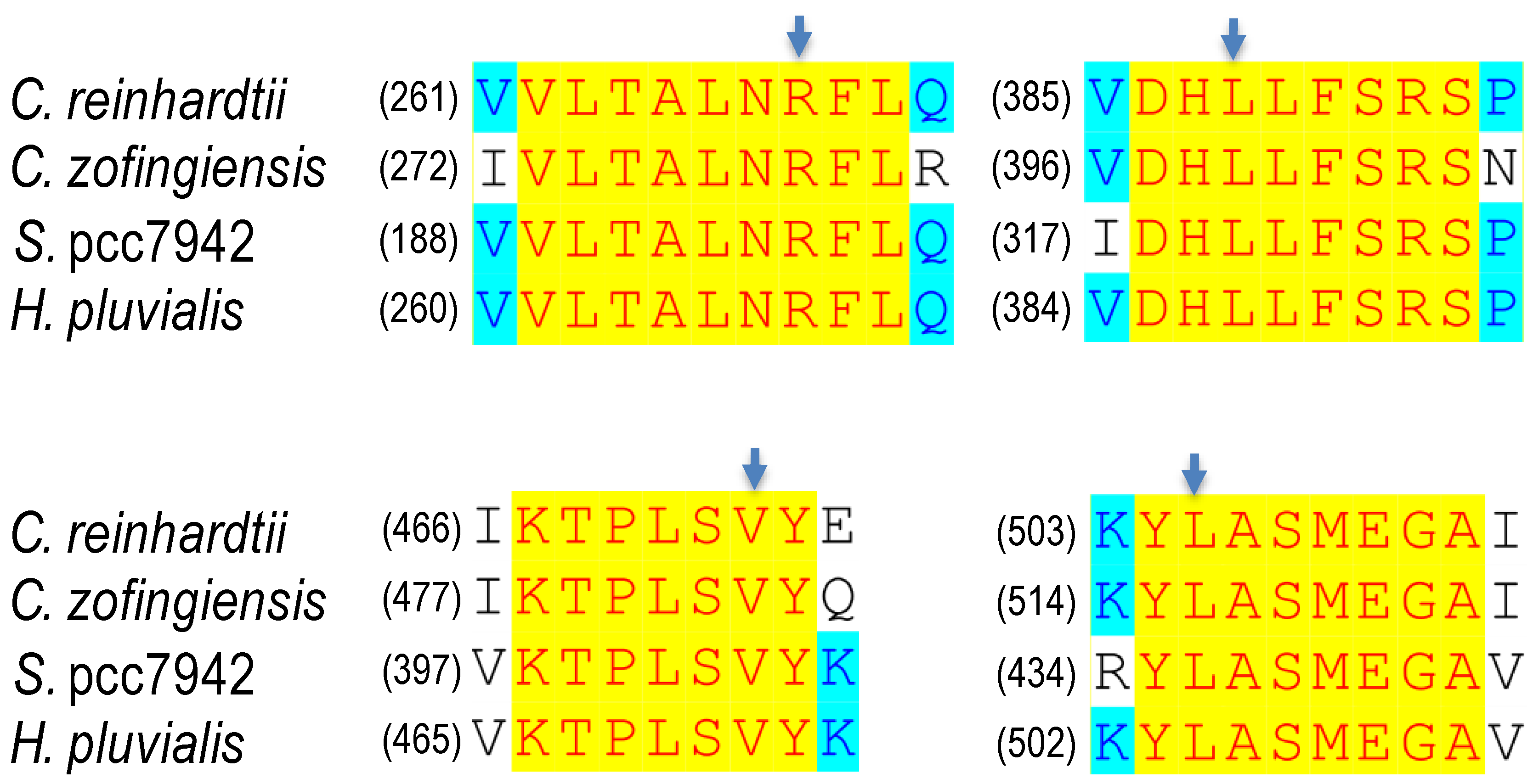 Point mutations that affect desaturation activity and norflurazon resistance of PDS. C. reinhardtii, Chlamydomonas reinhardtii; C. zofingiensis, Chlorella zofingiensis; S. pcc7942, Synechococcus pcc7942, H. pluvialis, Haematococcus pluvialis. Arrows indicate the positions of point mutations.