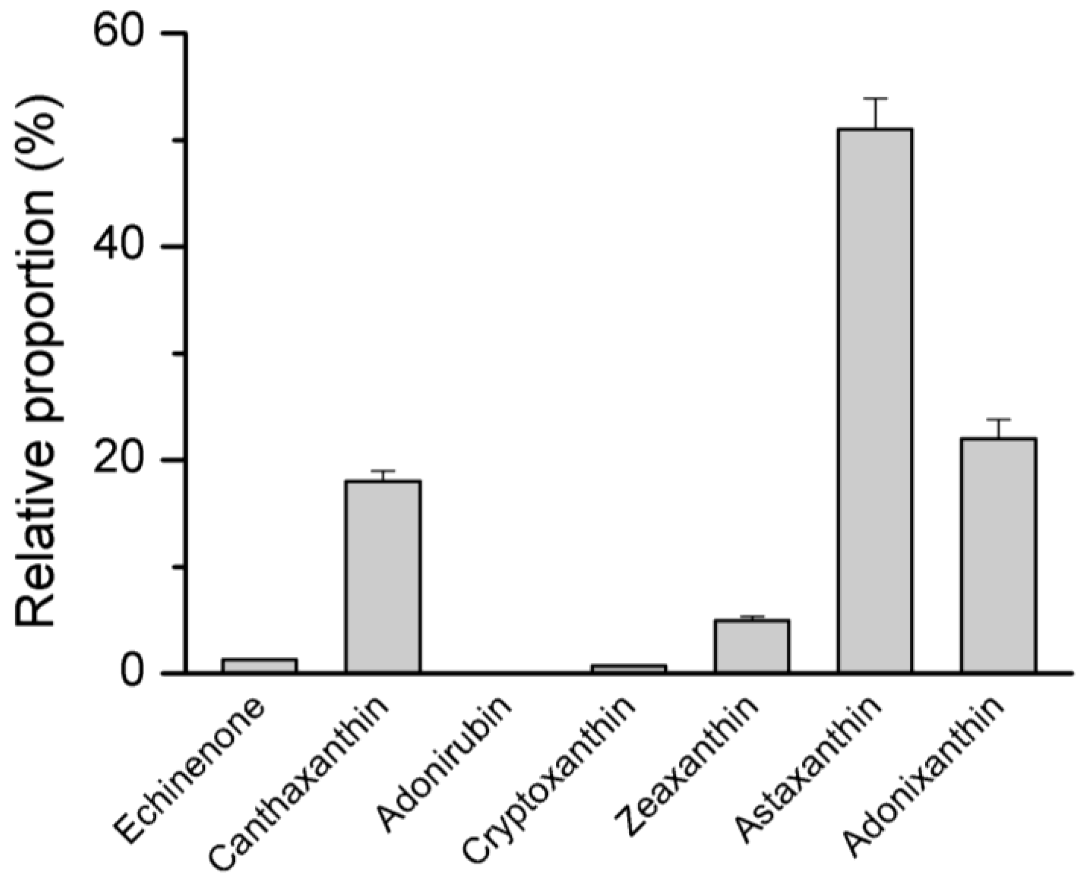 The relative proportion of carotenoids in C. zofingiensis under astaxanthin induction conditions (eight-day induction with 20 g·L−1 glucose in the dark). Each carotenoid is expressed as percentage of the sum of echinenone, canthaxanthin, adonirubin, cryptoxanthin, zeaxanthin, adonixanthin, and astaxanthin, which is set as 100%. Adonirubin is not detected.
