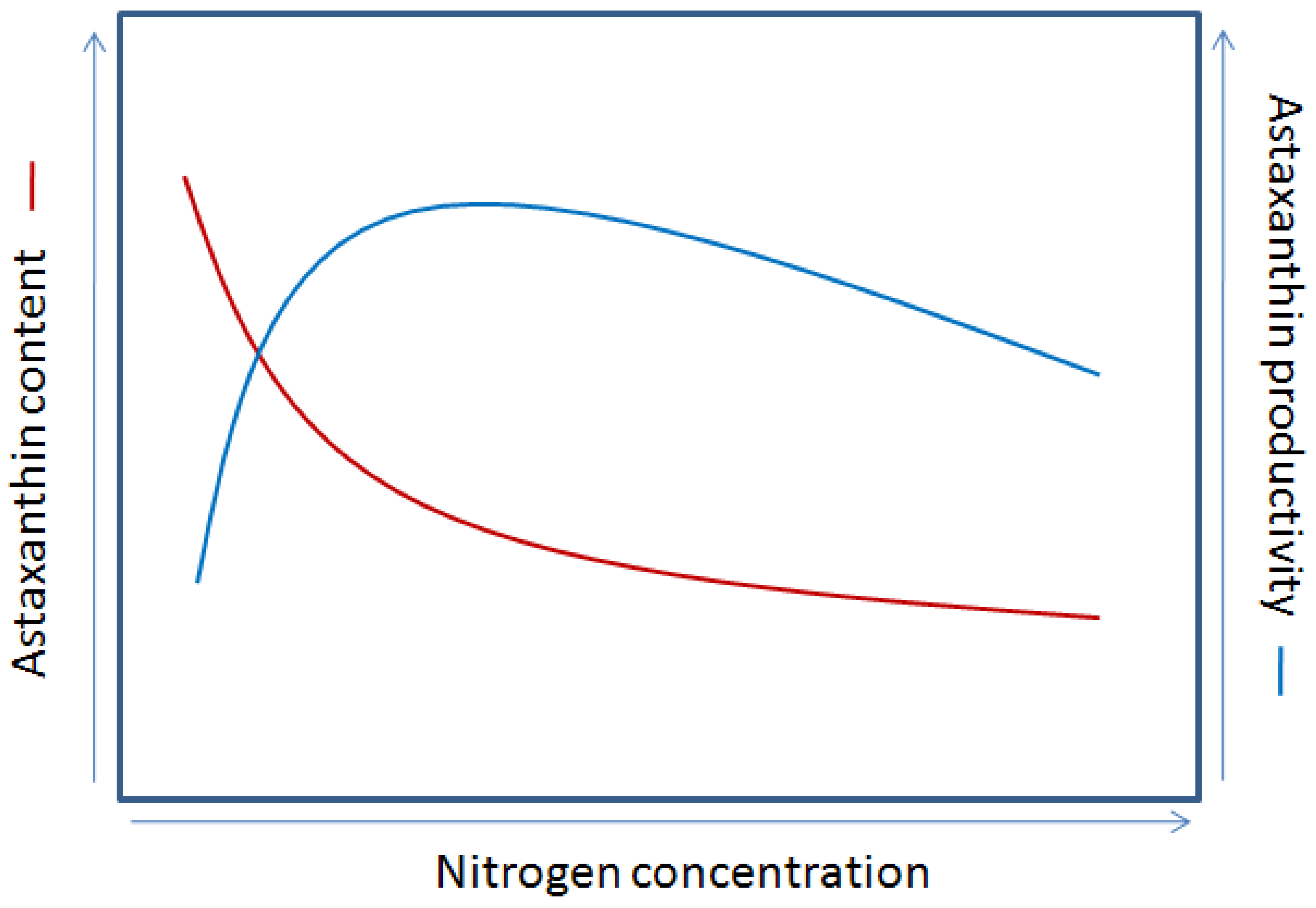 A schematic view of astaxanthin content and astaxanthin productivity as affected by nitrogen concentration for C. zofingiensis.