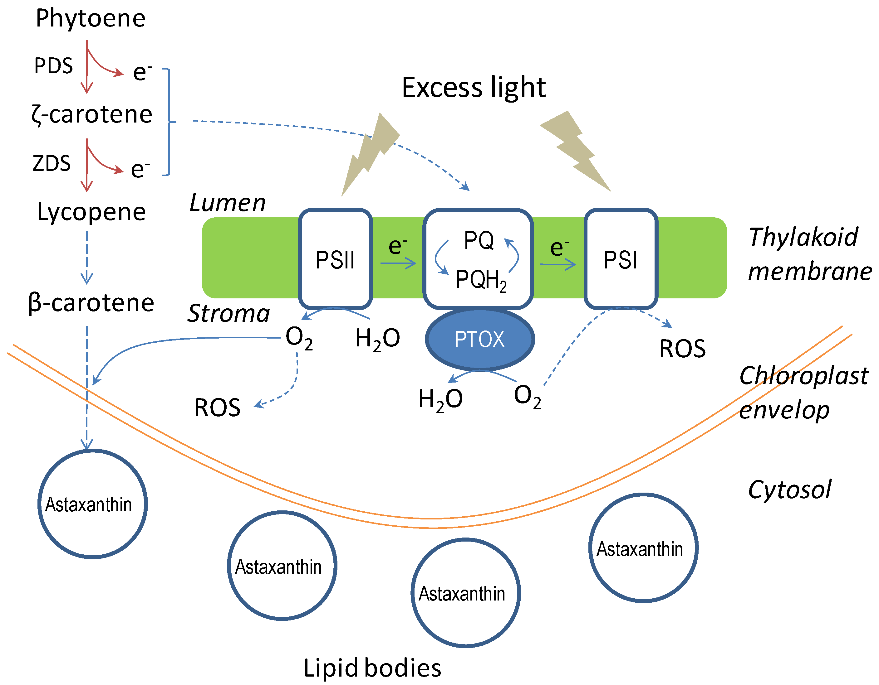 In C. zofingiensis, astaxanthin biosynthesis is believed to be regulated, at least in part, at the transcriptional level, as the mRNA level of carotenogenic genes is well coordinated with the intracellular content of astaxanthin. For instance, high light triggers the up-regulation of CHYb and BKT, and accordingly enhances the biosynthesis of zeaxanthin, canthaxanthin, and astaxanthin; while salinity stress up-regulates the expression of BKT only and thus promotes the biosynthesis of canthaxanthin and astaxanthin [83]. However, the 24–48 h delay between up-regulation of carotenogenic genes and the accumulation of astaxanthin indicate that they are not tightly coordinated and suggest that factors other than transcriptional control are involved in carotenoid biosynthesis. High light and salinity stresses stimulate the generation of ROS of different kinds, which may serve as the messenger molecule to trigger the expression of specific carotenogenic genes for enhanced astaxanthin accumulation. It is commonly perceived that the formation of astaxanthin is a survival strategy of the algae under photooxidative stress and other adverse conditions. Astaxanthin biosynthesis may offer multiple roles in protecting C. zofingiensis cells from those oxidative stresses (Figure 9), including (1) the accumulation of astaxanthin in cytoplasmic lipid bodies functioning as a “sunscreen” to reduce the amount of light impinging on chloroplast for attenuated photosynthetic photoinhibition and photodamage caused by excess photons; (2) lowering subcellular oxygen levels by forming oxygen-rich astaxanthin molecules; (3) converting photosynthetically evolved molecular oxygen into water via a concerted electron transport from carotenogenic desaturation steps through the photosynthetic plastoquinone pool (PQ) to plastid terminal oxidase (PTOX); (4) astaxanthin serving as an antioxidant to scavenge the generated ROS.