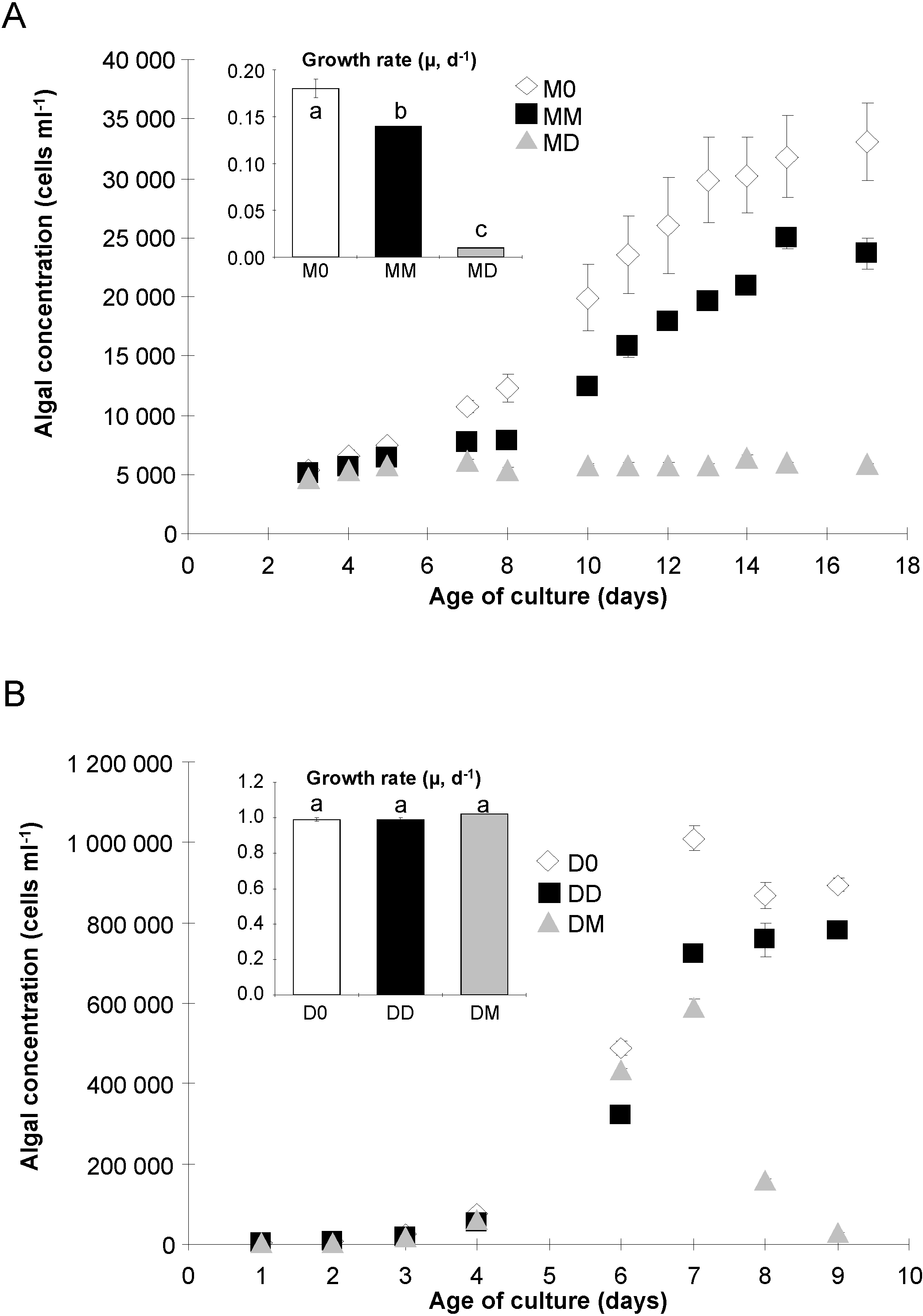 Population density (cells mL−1) of P. multiseries (A) and P. delicatissima (B) without added bacteria (M0 and D0, open diamonds), with the bacterial community of P. multiseries (MM and DM, filled squares) or with the bacterial community of P. delicatissima (MD and DD, grey triangles). Inserts show the specific growth rate µ (day−1) of each species. Letters indicate significantly different values (p < 0.05). Mean ± SE, n = 3.
