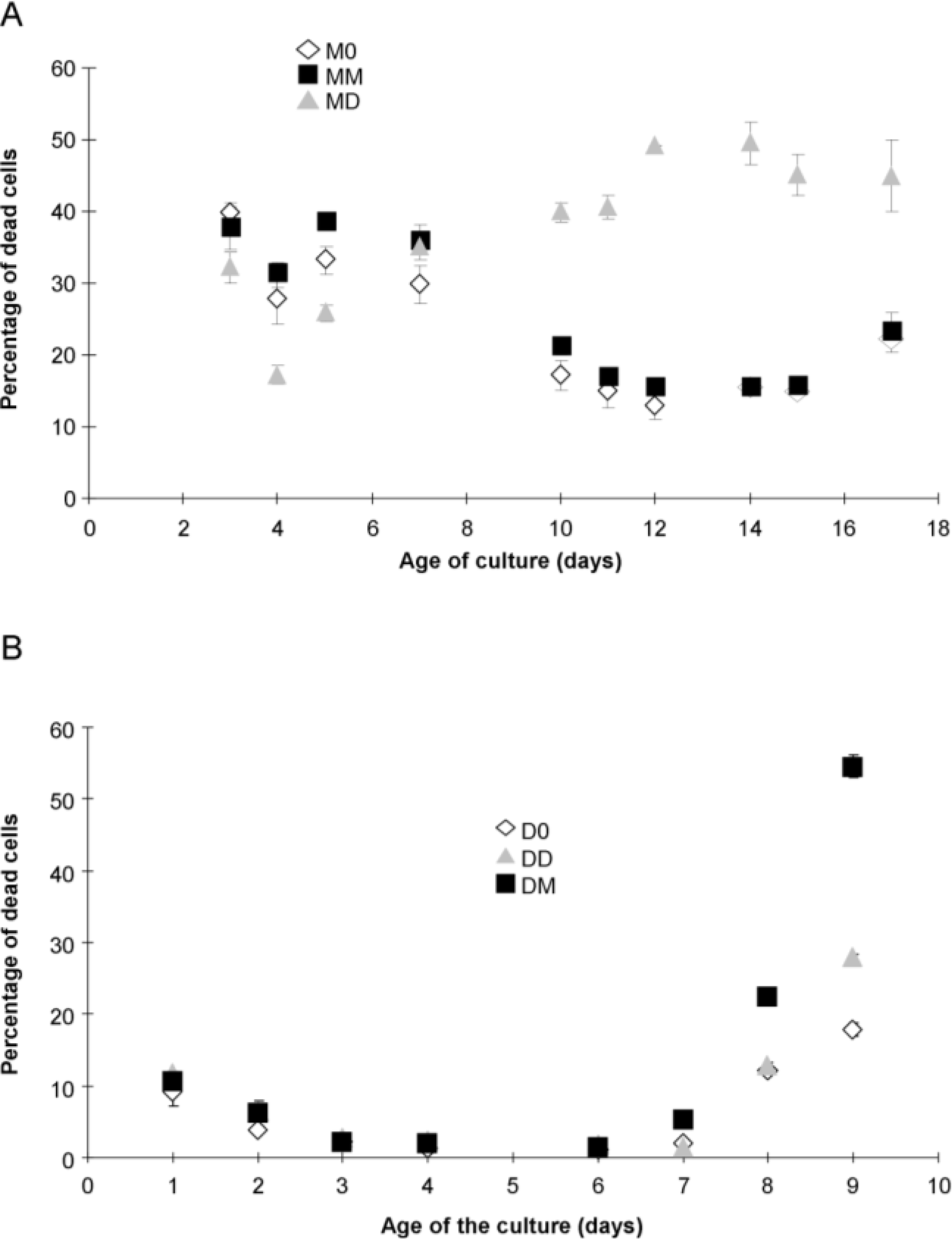 Percentage of dead P. multiseries (A) and P. delicatissima (B) cells, as determined by SYTOX Green staining: without added bacteria (M0, open diamonds), with the bacterial community of P. multiseries (MD, filled squares) or with the bacterial community of P. delicatissima (MM, grey triangles). Mean ± SE, n = 3.