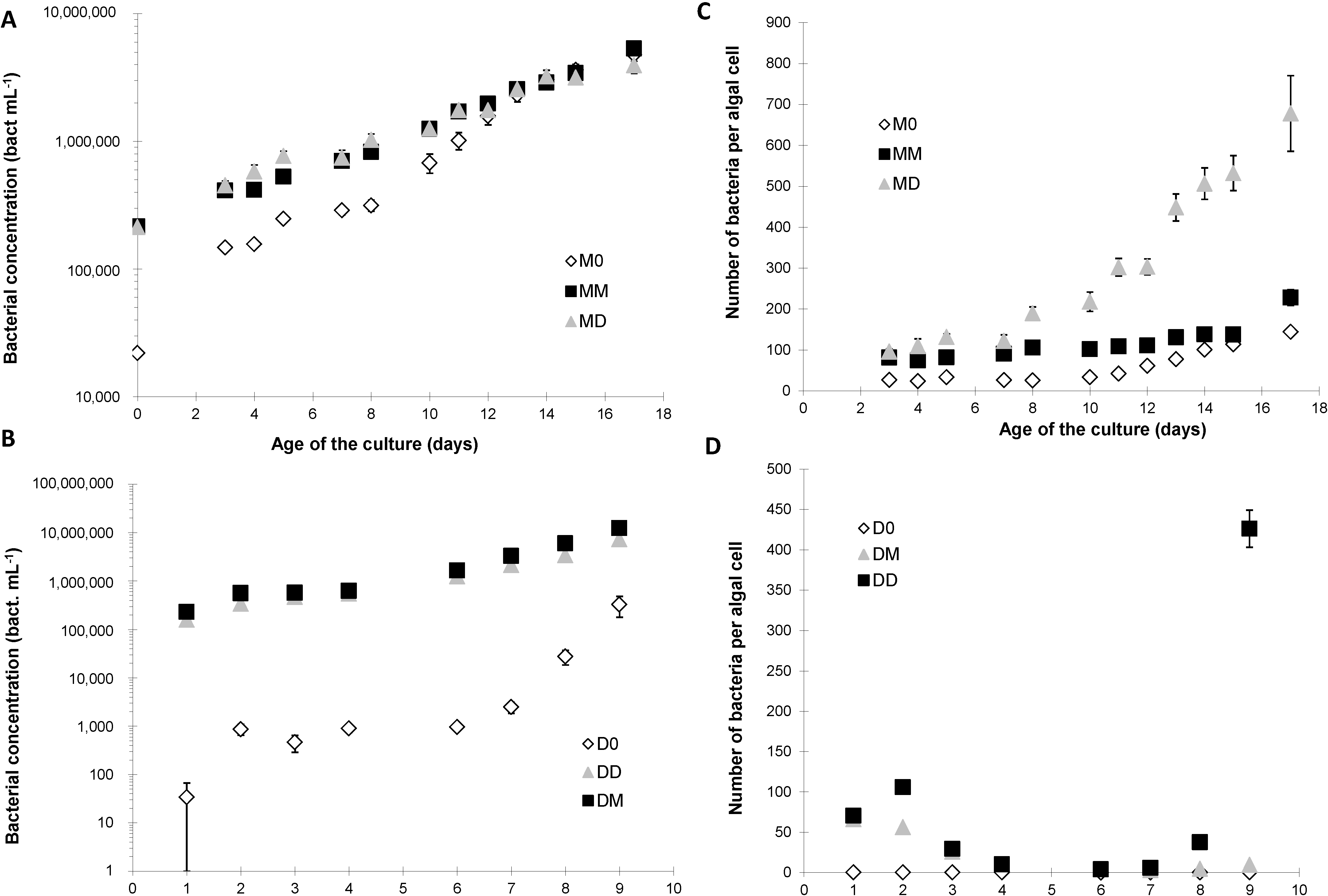 Concentration (bacteria mL−1, A,B) and number of free-living bacteria per algal cell (C,D) of free-living bacteria associated with P. multiseries (A,C) and P. delicatissima (B,D) without added bacteria (M0 and D0, open diamonds), with the bacterial community of P. multiseries (MM and DM, filled squares) or with the bacterial community of P. delicatissima (MD and DD, grey triangles). Mean ± SE, n = 3.