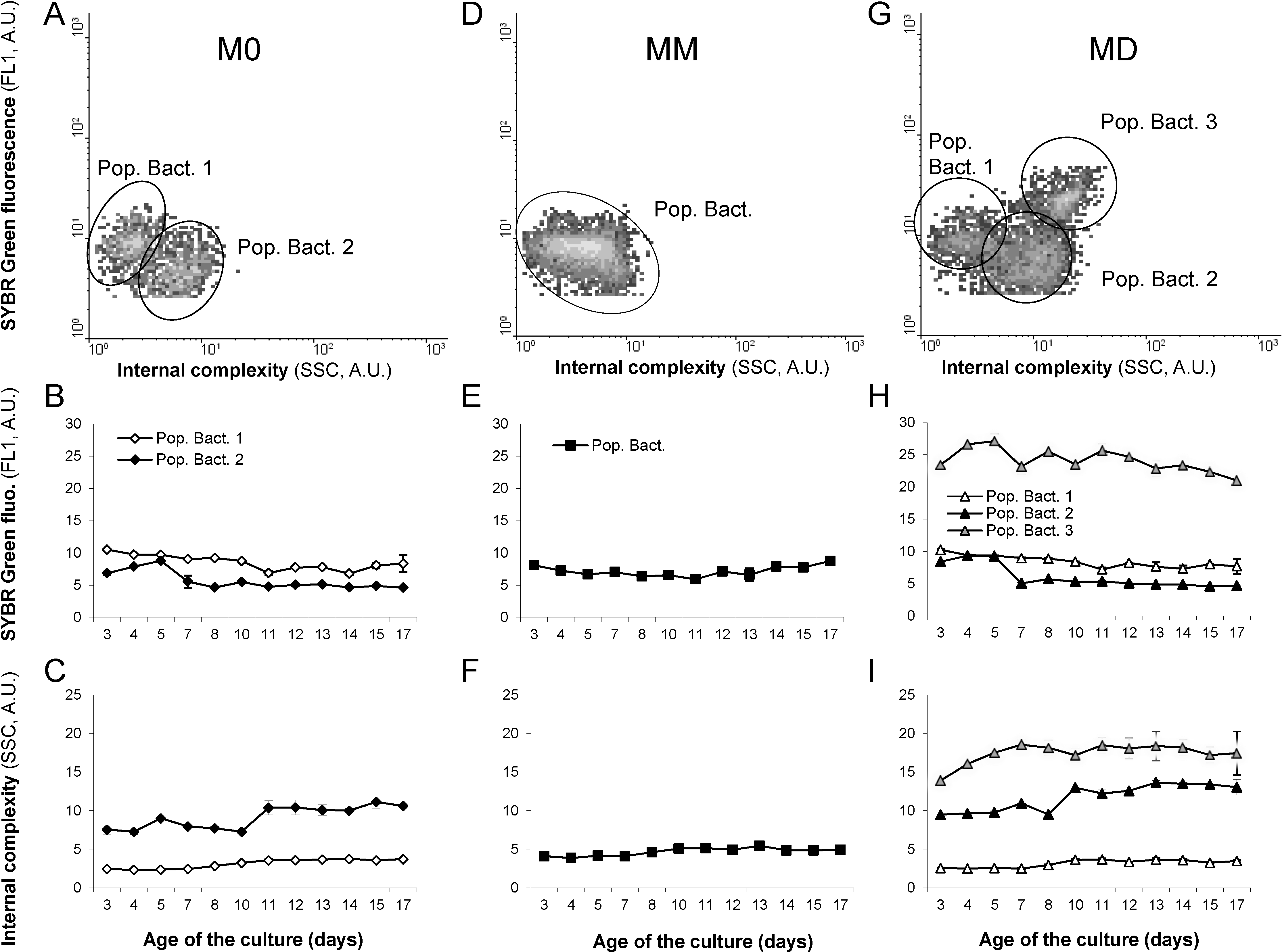 Flow cytometric determinations (in arbitrary units; A.U.) of internal complexity (as measured by Side Scatter “SSC”) and DNA content (as estimated by SYBR Green I fluorescence) of bacteria from M0 (A–C; containing 2 populations), from MM (D–F; containing 1 population) and from MD (G–I; containing three populations) and their variations/dynamics during culture (B,C,E,F,H,I). Mean ± SE, n = 3.