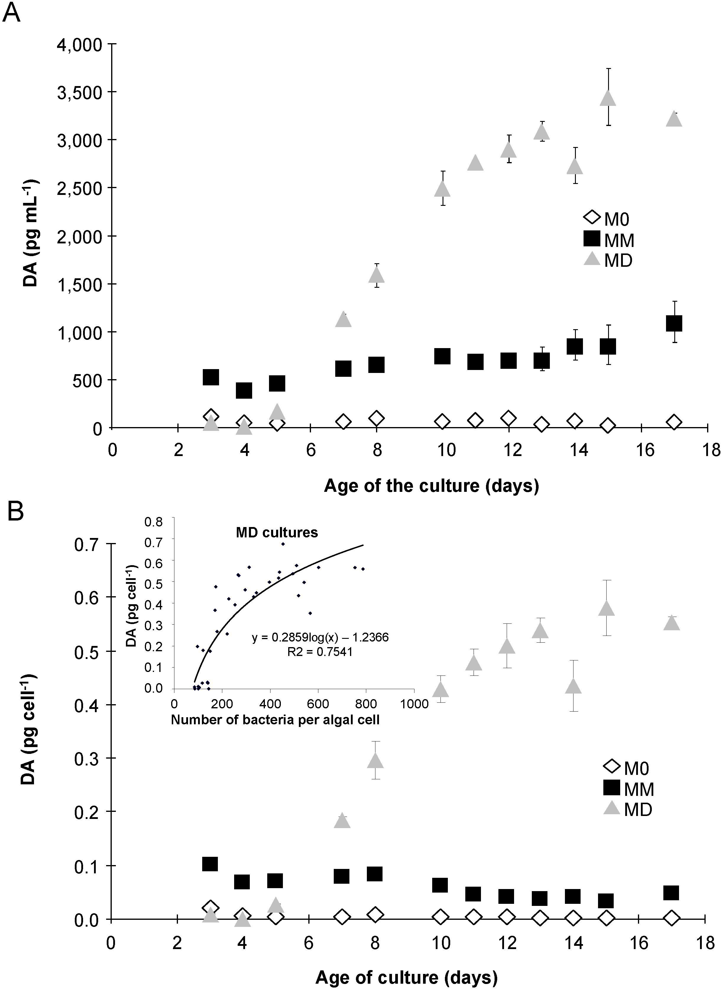 Total domoic acid (DA), as pg mL−1 (A) or pg cell−1 (B), in P. multiseries cultures grown without added bacteria (M0, open diamonds), with the bacterial community of P. multiseries (MM, filled squares) or with the bacterial community of P. delicatissima (MD, grey triangles). Mean ± SE, n = 3. Insert shows the significant relationship between “whole culture” DA per cell and the number of free-living bacteria per algal cell in the MD cultures (n = 35, p < 0.0001).