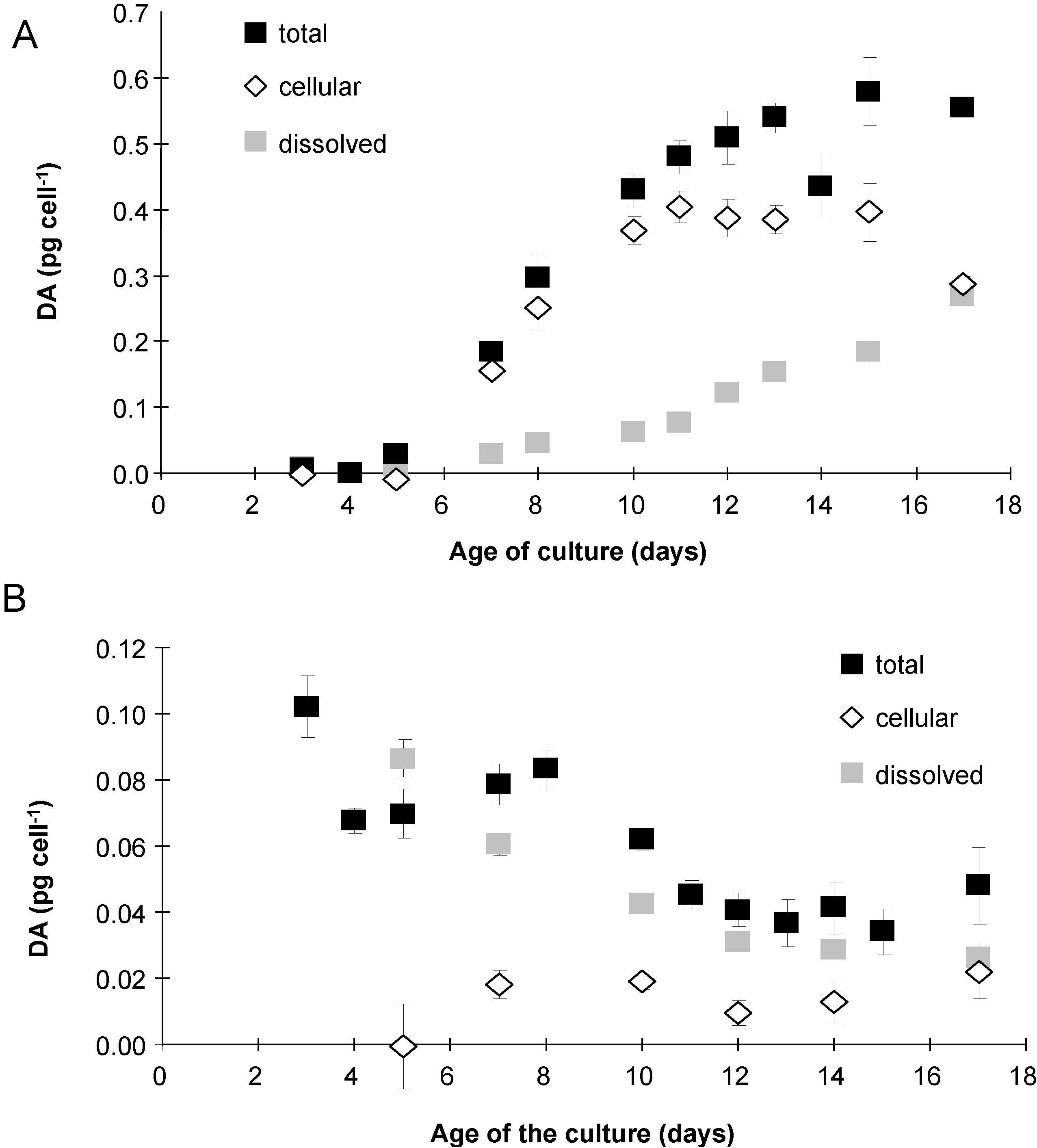 Total (filled squares), cellular (open diamonds) and dissolved (grey squares) domoic acid (DA) in P. multiseries cultures grown with (A) P. delicatissima bacteria (MD) or (B) P. multiseries bacteria (MM). Mean ± SE, n = 3.