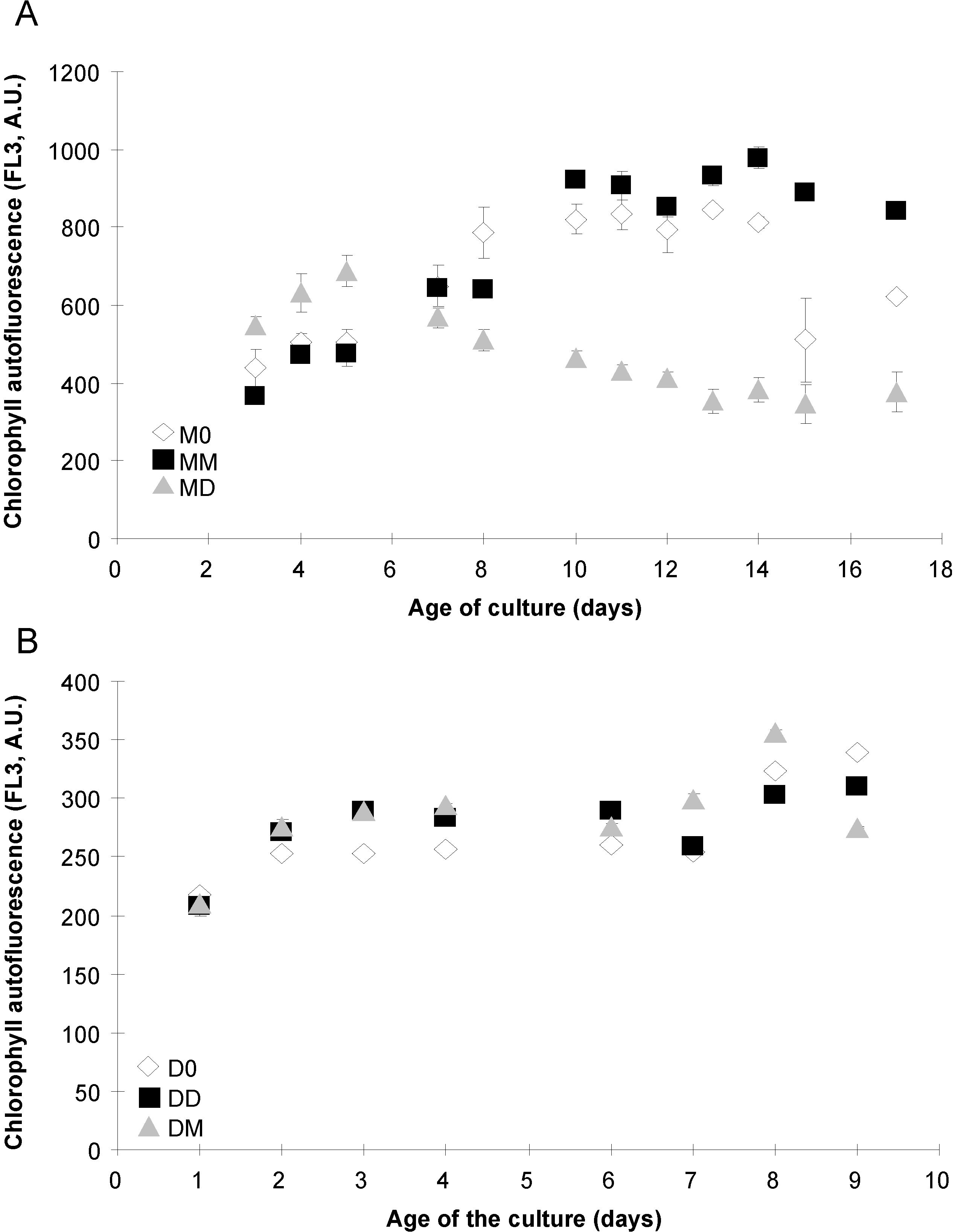 Cell autofluorescence (FL3, in arbitrary units, A.U.), related to chlorophyll content of P. multiseries (A) and P. delicatissima (B) grown without added bacteria (M0 and D0, open diamonds), with the bacterial community of P. multiseries (MM and DM, filled squares) or with the bacterial community of P. delicatissima (MD and DD, grey triangles). Mean ± SE, n = 3.