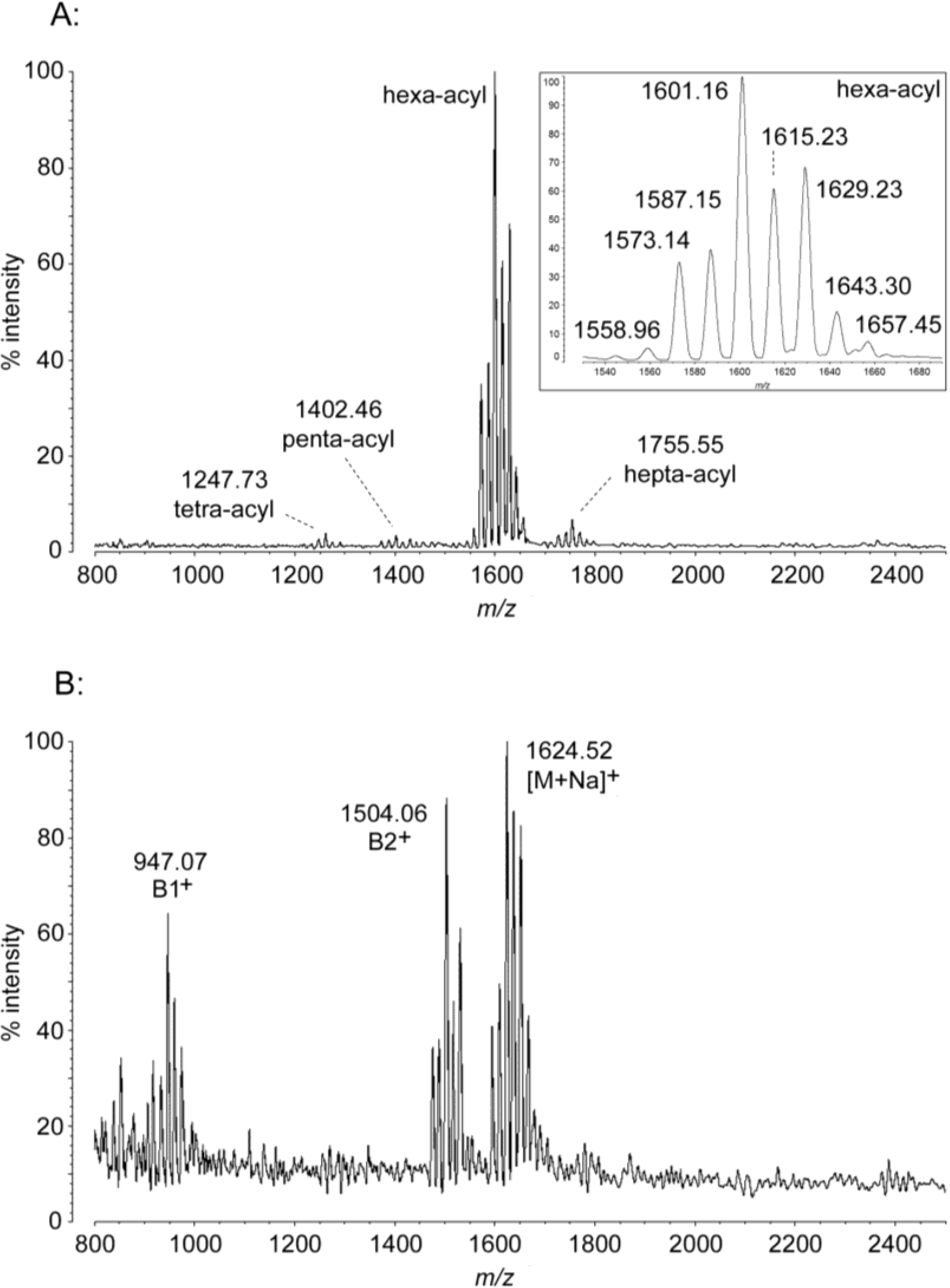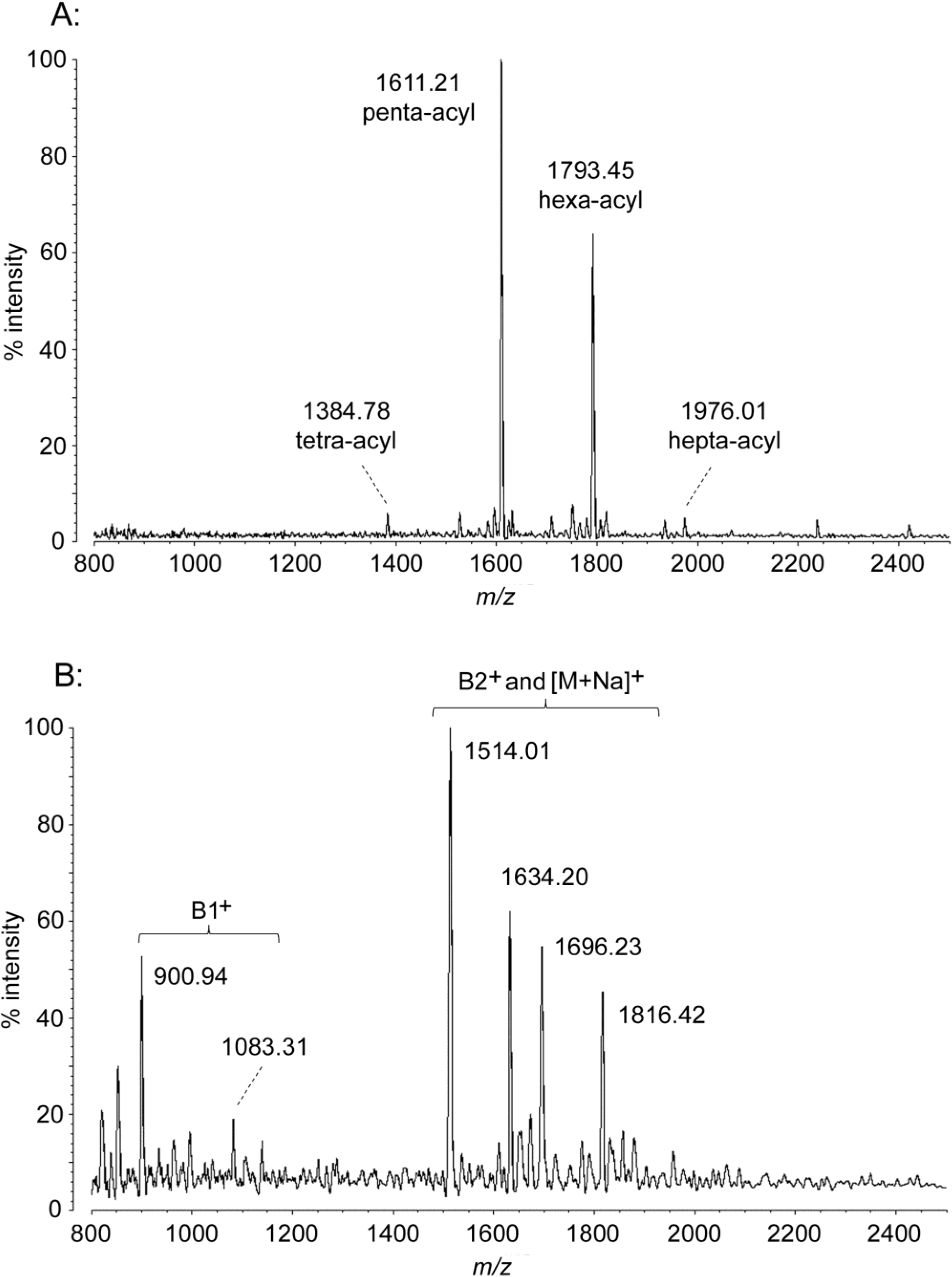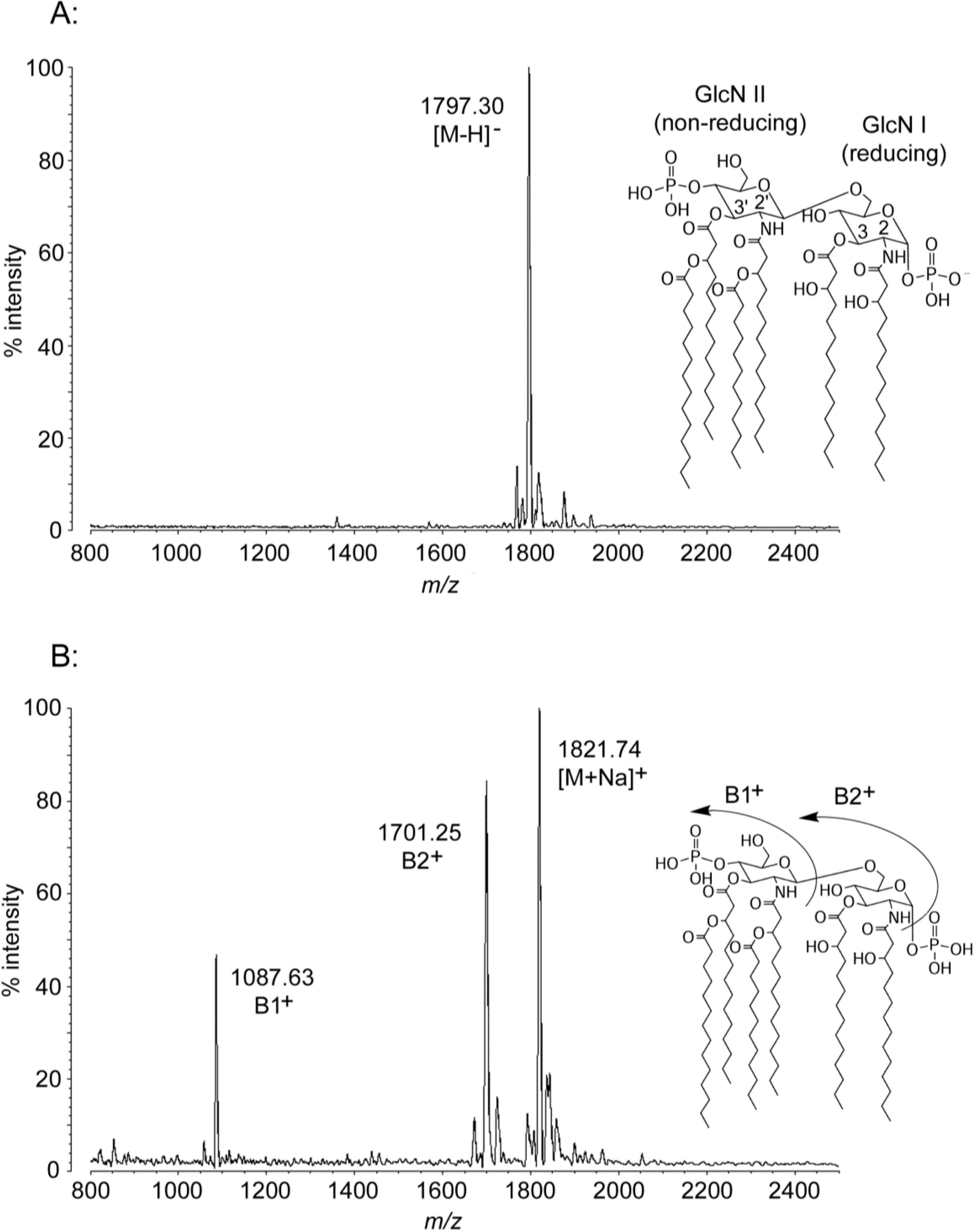 MALDI-TOF mass spectra of P. marina lipid A. Purified lipid A was prepared by mixing with ATT matrix as described in Materials and Methods. Spectral data were collected by Shimadzu Axima Confidence MS with a power setting of 65 and pulsed extraction at 2000 Da as the average of 1003 profiles in the linear negative mode (A) or 2000 profiles in the linear positive mode (B). Peak interpretation is shown on the spectra, and in Table 1.