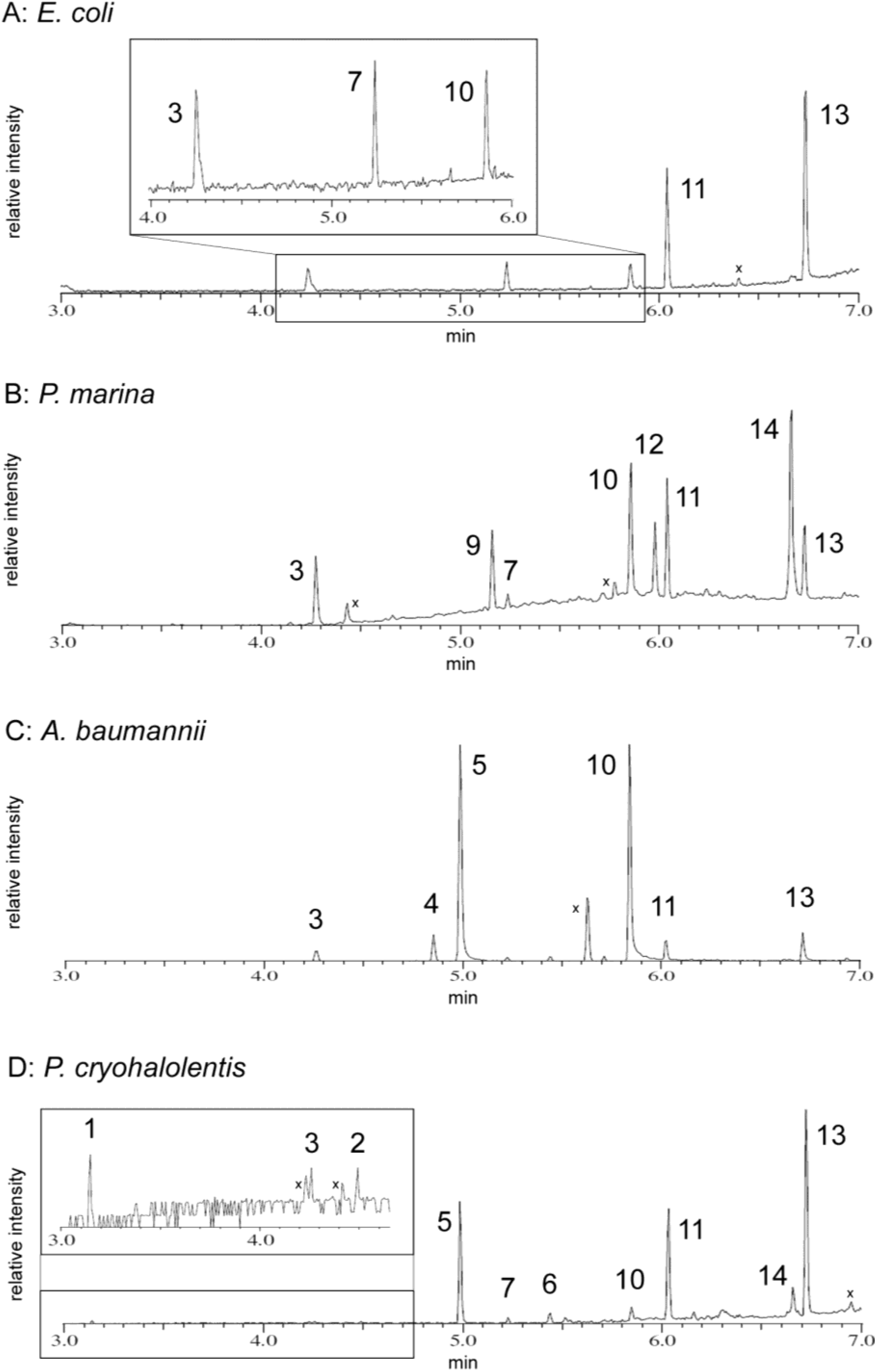 GC-MS Chromatogram of FAMEs derived from lipid extracts: Lipid extracts were converted to FAMEs and characterized by GC-MS as described in the Materials and Methods. FAMEs from E. coli (A); A. baumannii (B); P. marina (C); and P. cryohalolentis (D) extracts are indicated on the chromatogram by number, corresponding to identification in Table 2. The insets to (A) and (D) are expansions of regions with low-intensity peaks. Non-FAME peaks are marked with an “x”.