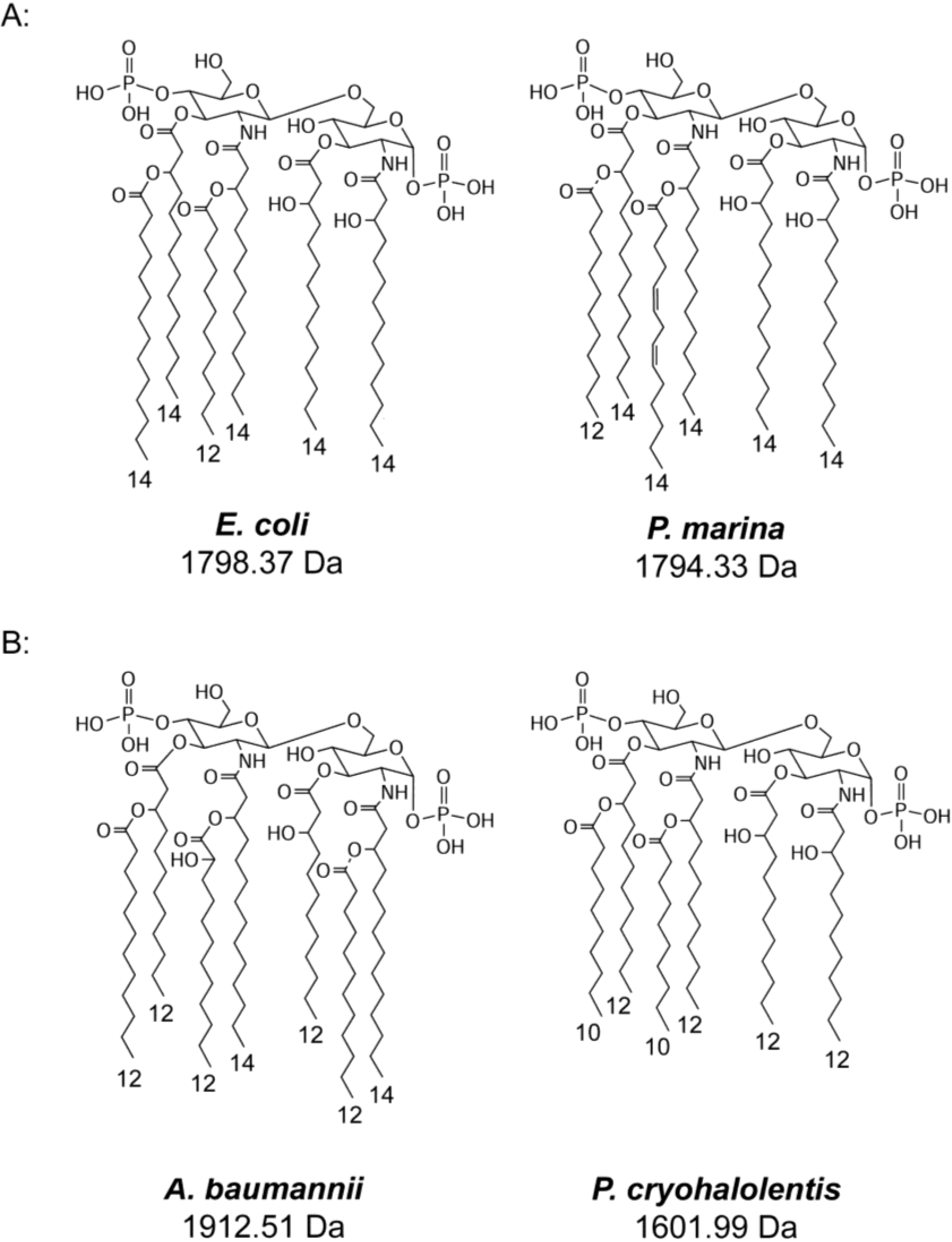 Comparison of proposed psychrophilic and mesophilic lipid A structures: These structures represent the most abundant molecular forms of lipid A in E. coli and P. marina (A) or A. baumannii and P. cryohalolentis (B) based on the summation of all structural data. Hashed bonds indicate non-stoichiometric substituents that give rise to major molecular forms.