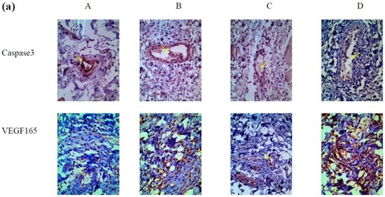 To explore the possible mechanism by which VEGF165-CS nanoparticles alleviated radiation-induced skin injury, we further examined the expression of VEGF165 and caspase3, which plays an important role in apoptosis in endothelial cells. As shown in Figure 5a, caspase3 expression was lower in groups C and D than in groups A and B. This result suggested that the effects of VEGF165 on inhibiting apoptosis and protecting endothelial cells in the form of nanoparticles were superior to those of a single injection and the control group. In addition, the expression of VEGF165 in groups C and D was significantly higher than that in groups A and B (Figure 5b). Furthermore, extensive vascular tissue and a complete lumen were observed in group D.