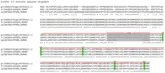 Multi-alignment of Sparus aurata (50882276), Dentex dentex (A4UQV9) and human (Q07869) PPARα sequences obtained with ClustalW program (CLUSTAL 2.1 multiple sequence alignment). Critical residues involved in binding with canonical agonists are depicted with a green background and numbered according to the human sequence. The Ligand Binding Domain (LBD) is indicated with a bold red line over the sequence. The Ω loop is indicated over the sequences, printed in medium grey and depicted with light grey background. The symbols under the sequences stand for sequence identity (*), strict conservation of residue type (:), loose conservation of residue type (.) and sequence variability (space).