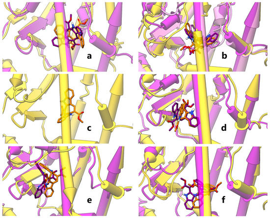 Representative MD structures of PPAR-CAU complexes. Panels a-f show CAU and representative MD structures of PPARα-CAU (magenta) and PPARγ-CAU (gold) complexes. In particular, panels show PPARα/γ I (a), PPARα II, III (this latter in mauve)/PPARγ II (b), PPARγ III (c), PPARα/γ IV (d), PPARα/γ V (e) and PPARα/γ VI (f) complex structures from MD representative frames. Proteins and ligands are shown as half-transparent pipes-and-planks and opaque stick with non-carbon atoms coloured by type (red: oxygen, blue: nitrogen, white: hydrogen), respectively. Complexes are grouped by similarity and shown in the same orientation, resulting from a recursive best-fit of protein heavy atoms, iterated by pruning distant atom pairs until no pair exceeds 2.0 Å.