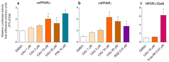 The predicted dual PPARα/γ partial agonist behaviour of CAU was then validated by PPARα and PPARγ luciferase reporter assays on COS-7 cells, in comparison with FFB and rosiglitazone (RGZ), chosen as PPARα and PPARγ selective agonists, respectively (Figure 4a,b). The results show the activation of PPARα- and PPARγ-mediated transcription after exposure to CAU 10 µM and 30 µM, with levels comparable to those induced by FFB 10 µM and RGZ 0.01 µM. In addition, since luciferase assays were based on the co-expression of PPAR/RXR heterodimers, we also used the RXRα/Gal4 system to rule out the direct activation of RXR (Figure 4c) by CAU. The obtained results clearly supported a dual PPARα/γ partial agonist behaviour of CAU.