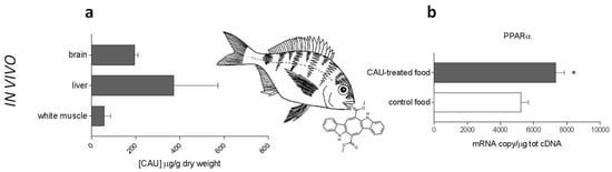 Juvenile fish were fed in controlled aquarium conditions for one month with CAU-enriched food. Subsequently, accumulation of CAU was evaluated in fish tissues (Figure 5a), showing that liver, brain and, to a lower extent, white muscle were able to accumulate orally-administered CAU. The measurement of relatively high levels of CAU in D. sargus brain provides the first evidence, to our knowledge, that the compound can cross the fish blood-brain barrier (BBB). Strikingly, accumulation of CAU in fish liver was paralleled by a significant upregulation of PPARα (Figure 5b), with induction levels comparable to those previously measured for D. sargus under field conditions [].