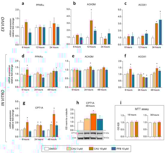 In particular, mRNA levels of ACADM increased after 12 h exposure to both CAU (3.4-fold) and FFB (1.9-fold) and ACOX1 showed a high up-regulation after 24 h exposure (3.0 and 3.6-fold for CAU and FFB, respectively). When assayed in a dose-dependent manner in a simpler cellular model (HepG2 cells), CAU and FFB induced the expression of PPARα responsive genes functioning in mitochondrial (ACADM, CPT1A) and peroxisomal (ACOX1) fatty acid β-oxidation (Figure 6d–g). In addition, we found significant overexpression of carnitine palmitoyltransferase 1A (CPT1A) protein at 48 h following CAU treatment in the same model (Figure 6h). The MTT viability assay demonstrated no cytotoxicity after exposure to CAU (Figure 6i).