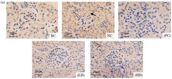 During apoptosis, the caspase-3 protein was positively expressed, and the immunoreactive product was stained in renal tubules. The expression of the caspase-3 protein in the mouse kidney is shown in Figure 6. Apoptosis was observed in each group. Compared with the blank group, caspase-3 showed obvious positive expression in the NC group, and the positive cells were increasingly dense. The positive expression of UPE was significantly reduced in mice after UPE treatment, suggesting that UPE may have a protective effect on apoptosis. Image J software was used to analyze the staining situation, and it was found that compared with the BC group, the protein expression level of the NC group was significantly increased (p < 0.05), and the expression level of caspase-3 decreased significantly after treatment (p < 0.05), which further proved the improvement effect of UPE on apoptosis.