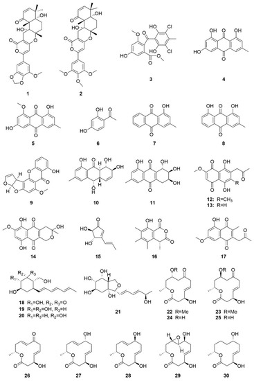 - Hussain, H.; Al-Sadi, A.M.; Schulz, B.; Steinert, M.; Khan, A.; Green, I.R.; Ahmed, I. A fruitful decade for fungal polyketides from 2007 to 2016: Antimicrobial activity, chemotaxonomy and chemodiversity. Future Med. Chem. 2017, 9, 1631–1648. [Google Scholar] [CrossRef]