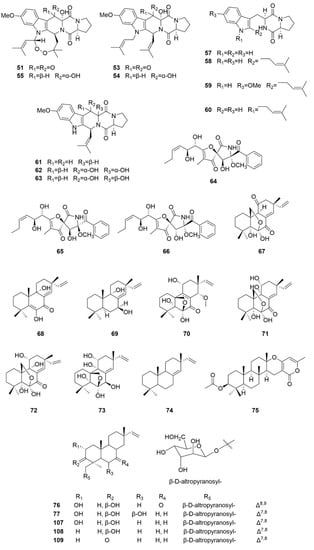 Nineteen compounds were isolated from the fungus Aspergillus fumigatus, associated with the sea cucumber S. japonicus, collected near Lingshan Island, Qingdao, China [33]. Among these 19 compounds are seven new prenylated indole diketopiperazine alkaloids, including compound 45, three spirotryprostatins (C–E) (46–48), two derivatives of fumitremorgin B (49 and 50), and 13-oxoverruculogen (51), along with 12 known compounds, including spirotryprostatin A (52), 13-oxofumitremorgin B (53), fumitremorgin B (54), verruculogen (55), 3-β hydroxy cyclo-l-tryptophyl-l-proline (56), cyclo-l-tryptophyl-l-proline (57), tryprostatin B (58), tryprostatin A (59), N-prenyl-cyclo-l-tryptophyl-l-proline (60), fumitremorgin C (61), 12,13-dihydroxyfumitremorgin C (62), and cyclotryprostatin A (63) [41]. Compound 45 showed weak cytotoxicity in HL–60 cells, with an IC50 value of 125.3 μM. Compounds 46–51 exhibited some cytotoxicity in MOLT–4 cells, HL–60 cells, A–549 cells, and BEL-7402 cells. Compound 48 showed higher activity in MOLT–4 and A–549 cells than the others, with an IC50 value of 3.1 μM for both cell types. Compound 49 showed higher activity in BEL–7402 cells than the others, with an IC50 value of 7.0 μM. Compound 51 showed higher activity in HL–60 cells than the others, with an IC50 value of 1.9 μM [41]. Compound 53 was also isolated from the fungus Aspergillus sp., associated with the sea cucumber S. japonicus, collected from Lingshan Island, Qingdao, China [42]. Two new compounds, pseurotin A1 (64) and A2 (65), as well as pseurotin A (66) were also isolated from the fungus Aspergillus fumigatus, associated with the sea cucumber S. japonicus. Compound 65 exhibited slight cytotoxicity in A549 and HL-60 cells, with IC50 values of 48.0 and 70.8 μmol/L, respectively, and compound 66 showed slight cytotoxicity in HL-60 cells, with an IC50 value of 67.0 μmol/L [60].