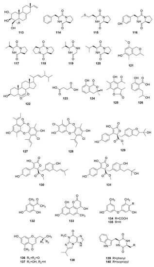 To date, 145 natural products have been isolated from sea-cucumber-associated microorganisms (Figure 2). These compounds include polyketides, alkaloids, and terpenoids, among others. These natural products have diverse properties, such as cytotoxic [37,39,45], antimicrobial [44], enzyme-inhibiting [46], and antiangiogenic activities [47].