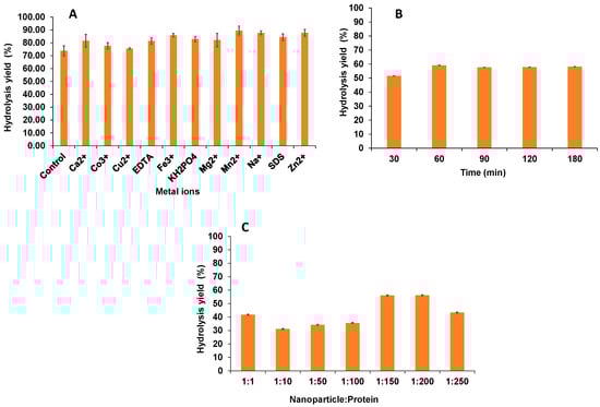 Overall, the results showed that the addition of metal ions enhanced alginate lyase activity. Mn2+, Zn2+, Na+, and Fe3+ resulted in 89.5 ± 3.4%, 87.8 ± 2.6%, 87.7 ± 1.5%, and 85.9 ± 1.2% of the activity of the untreated samples, respectively, and enhanced the hydrolysis of alginate to more than 85% (~15% higher than control) (Figure 1A). However, the addition of Co3+ and Cu2+ showed 77.72% and 75.60% enzyme activity, respectively, which was slightly higher than that of the control (73.82%). Earlier studies have reported that different metal ions exhibit different effects on the activity of alginate lyase as observed in this study [,,]. Previous findings reported the inhibitory effect of most of the metals including Na+ and Mg2+ which is contrary to the present findings []. The results from this study confirmed the enhanced activity of the enzyme by using magnetic nanoparticles for immobilization. Glutaraldehyde was used as the crosslinker. The maximum binding of glutaraldehyde with the nanoparticles was achieved within 1 h of incubation as shown in Figure 1B. About 50% relative activity was recorded in 30 min, and a further 9% increase was observed by doubling the time. There was no considerable improvement observed upon further extending the time to 180 min. As compared to other hydrolytic enzymes, pectinase was incubated overnight to achieve activation with glutaraldehyde (10% v/v of glutaraldehyde and 25 °C) [] and, with chitosan nanoparticles, the activation of magnetic nanoparticles was achieved in a 30 min incubation []. However, this study demonstrated the maximum activation of the nanoparticles with the glutaraldehyde crosslinker was achieved in 60 min for immobilized AL. Hence, the time required for the activation of magnetic nanoparticles varies as compared to previous studies, based on the concentration and type of particle used. The binding efficiency of the protein load onto the magnetic nanoparticles was confirmed by protein assay. The protein loading was optimized by loading different concentrations of alginate lyase (units) onto nanoparticles and the results were analyzed by determining the enzymatic activity for various nanoparticle:protein ratios including 1:1, 1:10, 1:50, 1:100, 1:150, 1:200, 1:250 as shown in Figure 1C. There was a significant enhancement in the enzymatic activity with the increase in the protein:nanoparticle ratio. Upon increasing protein load from 1:10 to 1:50 and 1:100, a constant increase in the binding efficiency by 13% was observed. A maximum of 71% protein binding was observed at a protein:nanoparticle ratio of 1:150 (5 mg/mL of nanoparticles:750 mg of protein). With the further increment in the protein load to 1:250, no improvement in binding was observed (Figure 1C). No similar data for binding efficiency of alginate have been reported in the literature.