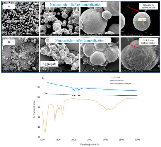 The immobilized enzyme was characterized using scanning electron microscopy (SEM) as shown in Figure 2A,B. The study shows that the nanoparticles were spherical in shape, with size ranging from 500 nm to 300 µm. Before immobilization, the nanoparticle structure appeared to be smooth, spherical, uniform, and spongy. However, after immobilization the size of the nanoparticles appeared to be enlarged and they formed aggregated clusters as shown in Figure 2B. This suggests that the crosslinking of the nanoparticles with enzyme was successful, confirming immobilization. The immobilized enzyme was further characterized and was confirmed using FTIR as shown in Figure 2C. The results showed the maximum peak area between the wavelength of 1700–2350 cm−1. The peak at the 2900–3000 cm−1 wavelength demonstrated the vibrations of C–H bond stretching and the broad band at 3430 cm−1 showed the stretching of the hydrogen bond in O–H groups []. The peaks observed at 1440–1450 cm−1 and below 1000 cm−1 indicate the vibration due to the stretching of C–O–C and C–H in the enzyme []. Bands observed within the area of 1560–1570 cm−1 depicted the bending vibrations of amide II and the stretching vibration of amide I, and a further C=O group was confirmed with the band [,]. The residues of C–O showed the stretching vibrations from uronic acid coming from the enzyme at 945 cm−1 []. The results obtained were significantly comparable to the study conducted for the production of oligosaccharides of alginate from Stypocaulon scoparium through alginate lyase [] and where chitosan was used for immobilization of alginate lyase [] as similar peaks were observed in these studies.