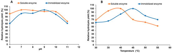 Effect of varying reaction conditions: (A) pH range from pH 6–11 and (B) temperature (30–55 °C) in the hydrolysis of sodium alginate by soluble and immobilized enzyme.