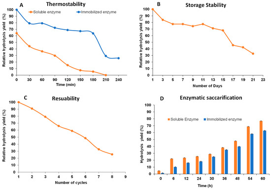 (A) Thermostability studies of soluble and immobilized enzyme (45 °C); (B) Reusability studies of immobilized alginate lyase after storage of immobilized alginate lyase (every third day when stored at 4 °C) for 23 consecutive days; (C) Activity of immobilized enzyme was determined for 8 consecutive cycles; and (D) Hydrolysis of alginate sourced from a raw seaweed (bull kelp) biomass by free and immobilized enzyme for 60 h.