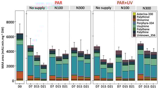 MAA areas (mAU min mg−1 DW) measured in Palmaria palmata during cultivation experiment, on 1st, 7th, 15th and 21st days (i.e., D0, D7, D15 and D21), under PAR or PAR + UV light, according to three nitrate levels (i.e., NaNO3 at 0 (seawater with no supply), 100 (N100) or 300 µM (N300)).